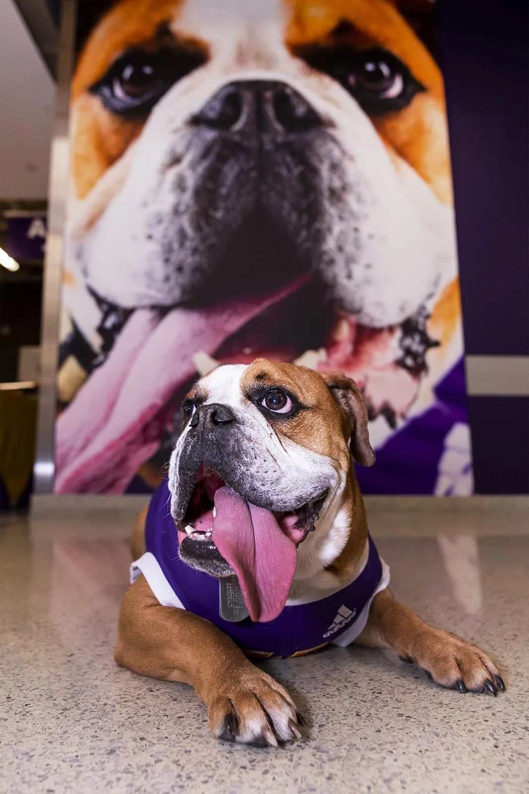 Live Mascot Colonel Rock IV, also known as Ray, strikes a pose in front of his wall-sized tribute during his 5th birthday party.