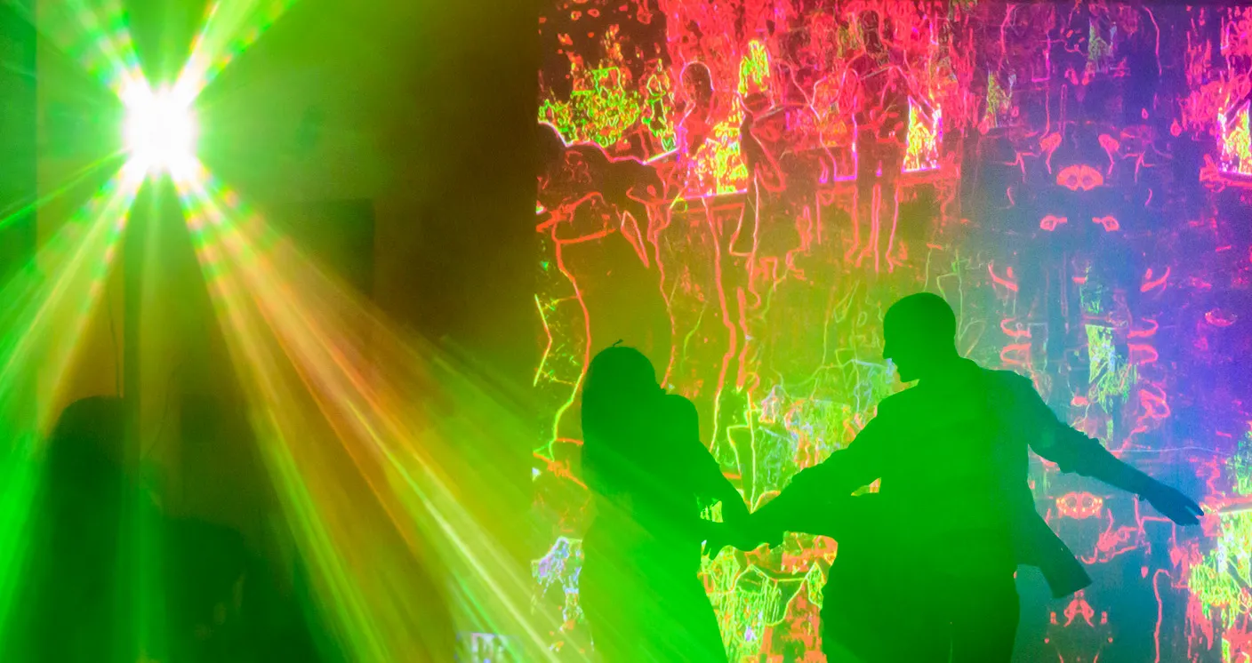 People join hands during an immersive light and sound event aimed at inspiring introspection and relaxation in the Rest Lab, a pop-up space for intentional rest in the Contemporary Gallery.