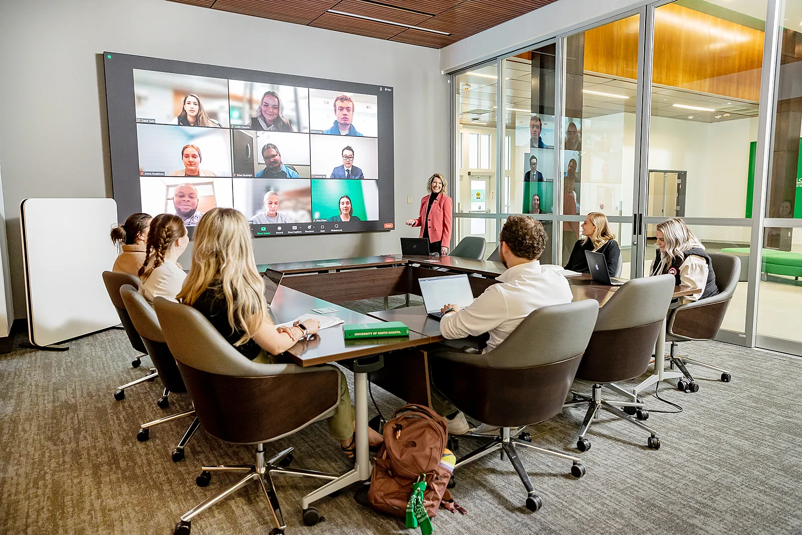 Professor Tammy Gerszewski teaches a hybrid class in a new classroom space in the business college.