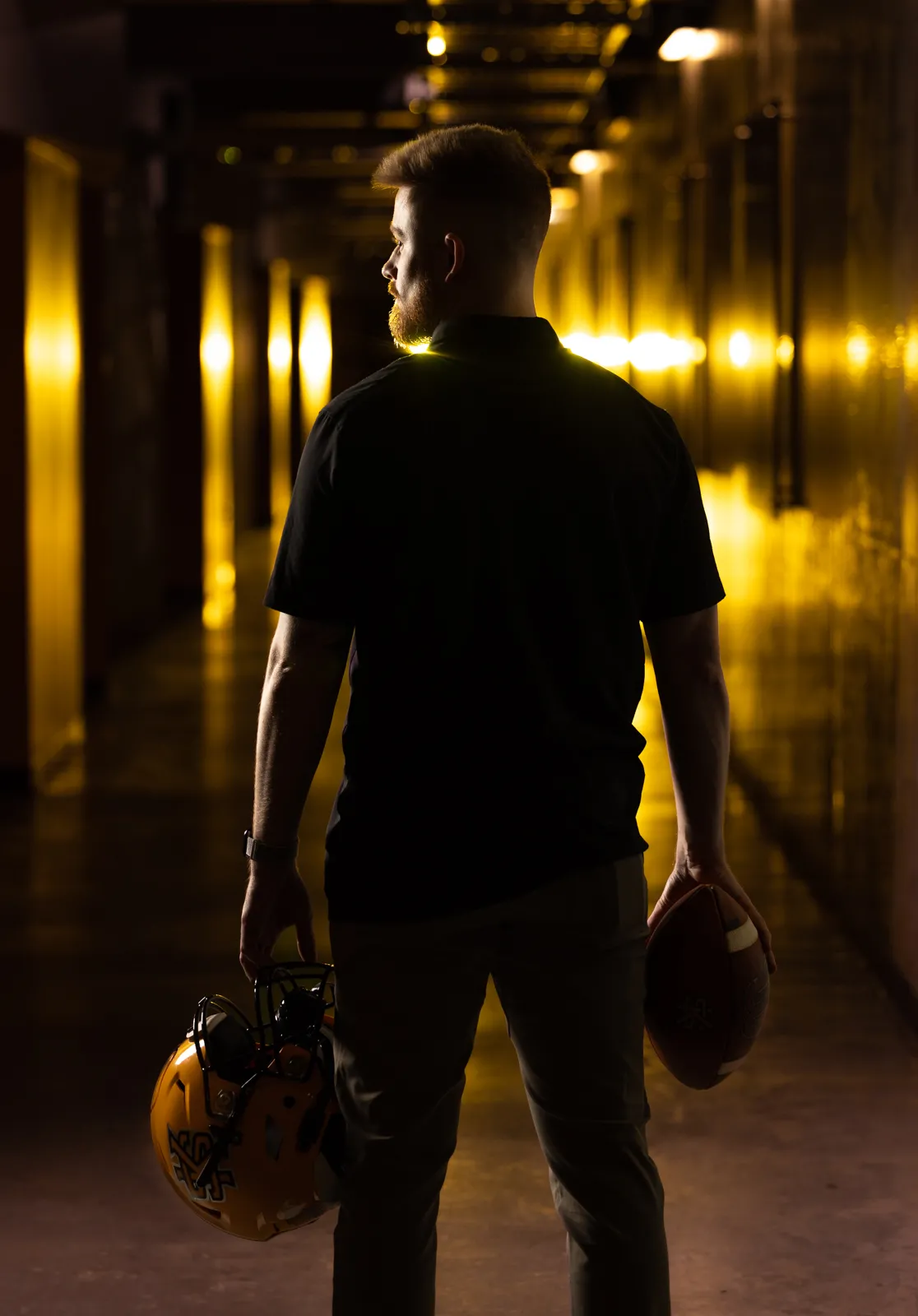 The communications department is releasing a series of stories where past student-athletes return to coach the next generation of athletes. This photo was created for the quarterback coach.