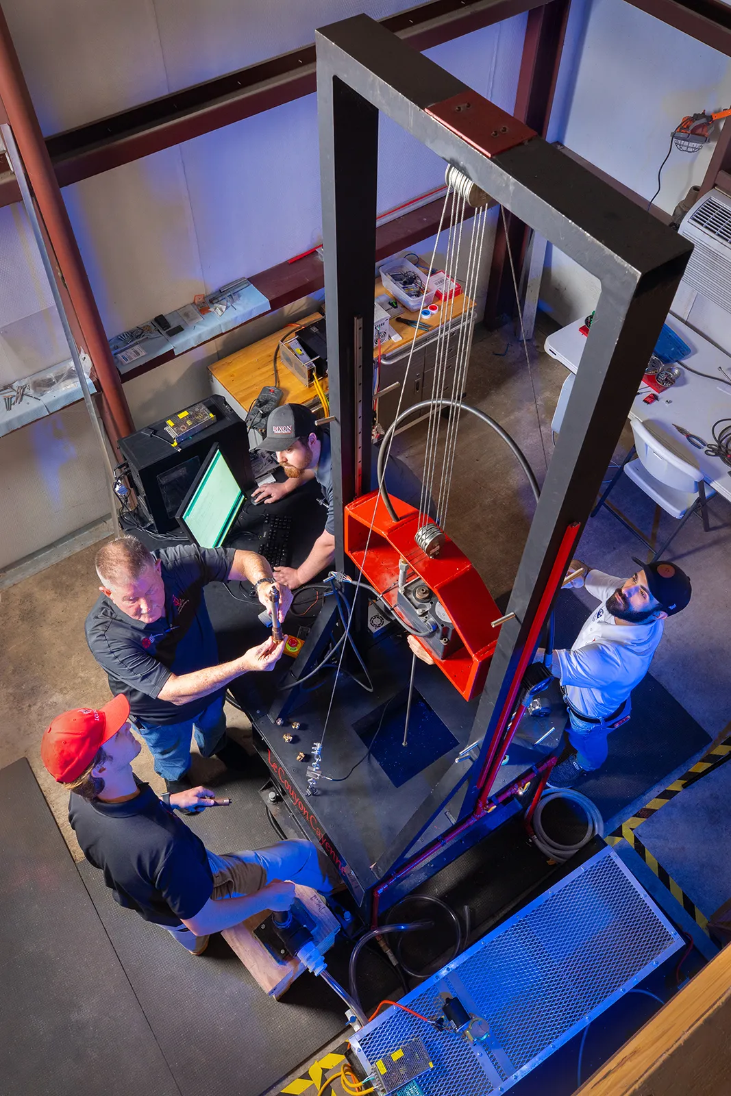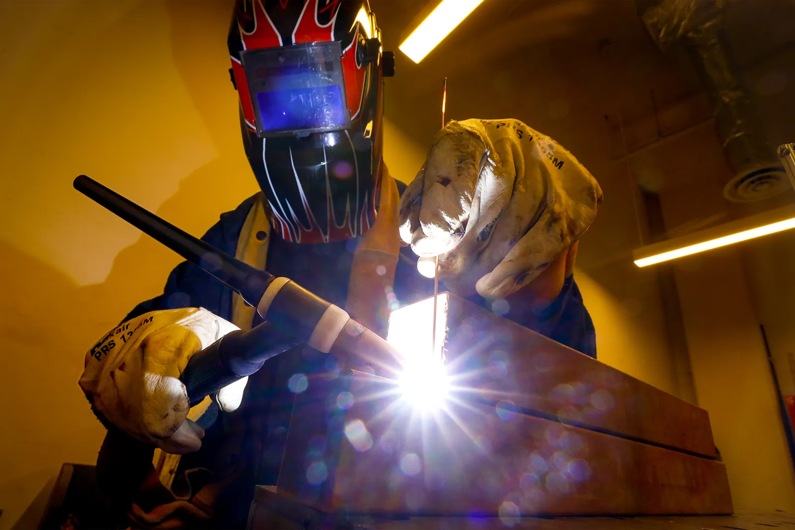 University of Illinois Chicago College of Engineering Steel Bridge Club member Zach Barwock tag welds a jig for the bridge project