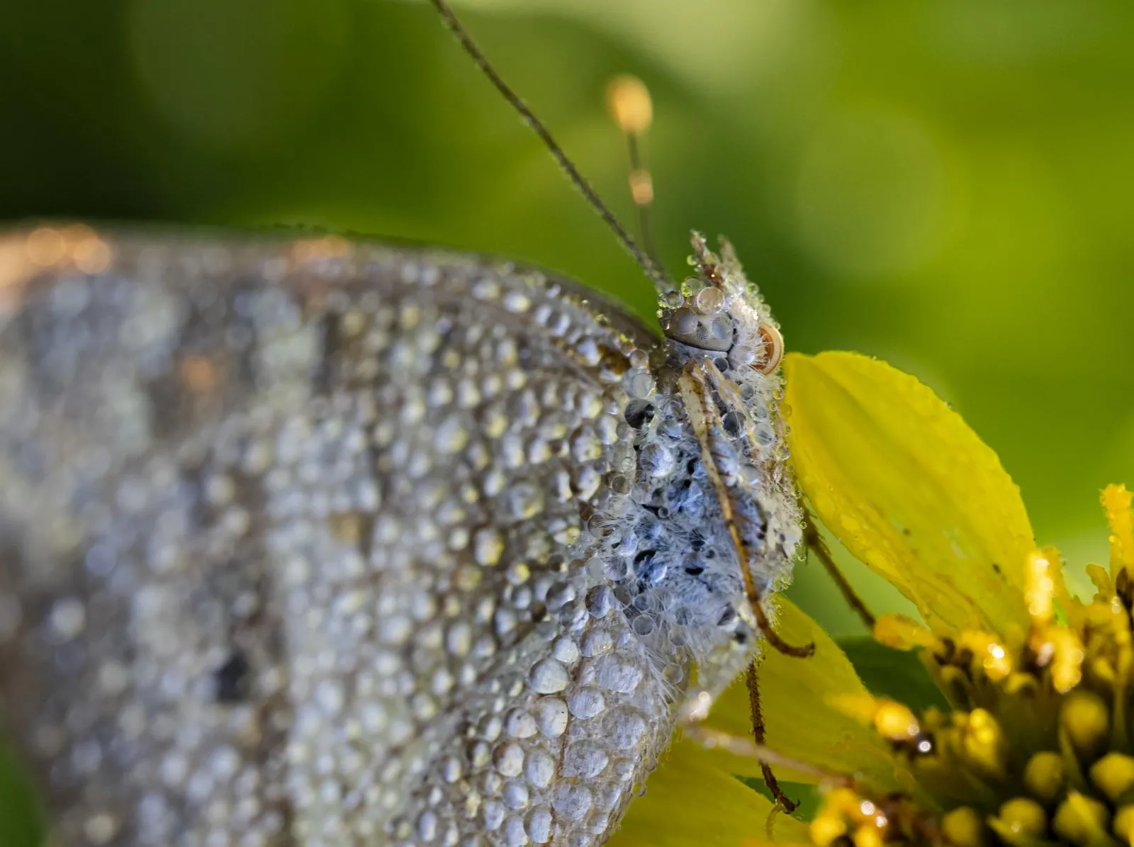 A peacock butterfly weighed down by dewdrops rests on a flower at the Randell Research Center, a cultural heritage site and university facility located on Pine Island, Fl. The butterfly cannot fly with the weight of the water on its wings and body and must wait until the sun is high enough to evaporate the droplets.