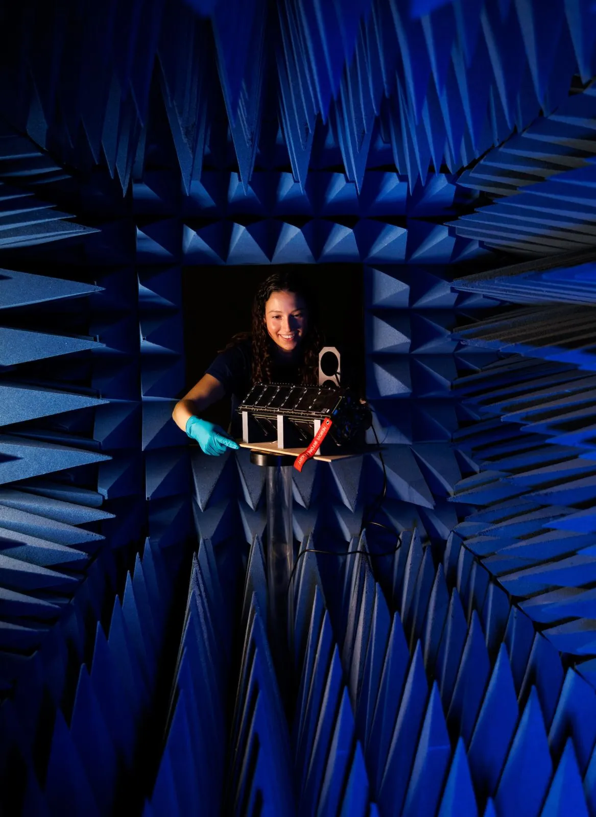 Students use an anechoic chamber to tune the mZ circuit board’s dipole antenna on a CubeSat. The chamber simulates a space-like environment with isolation from other materials and reflections.