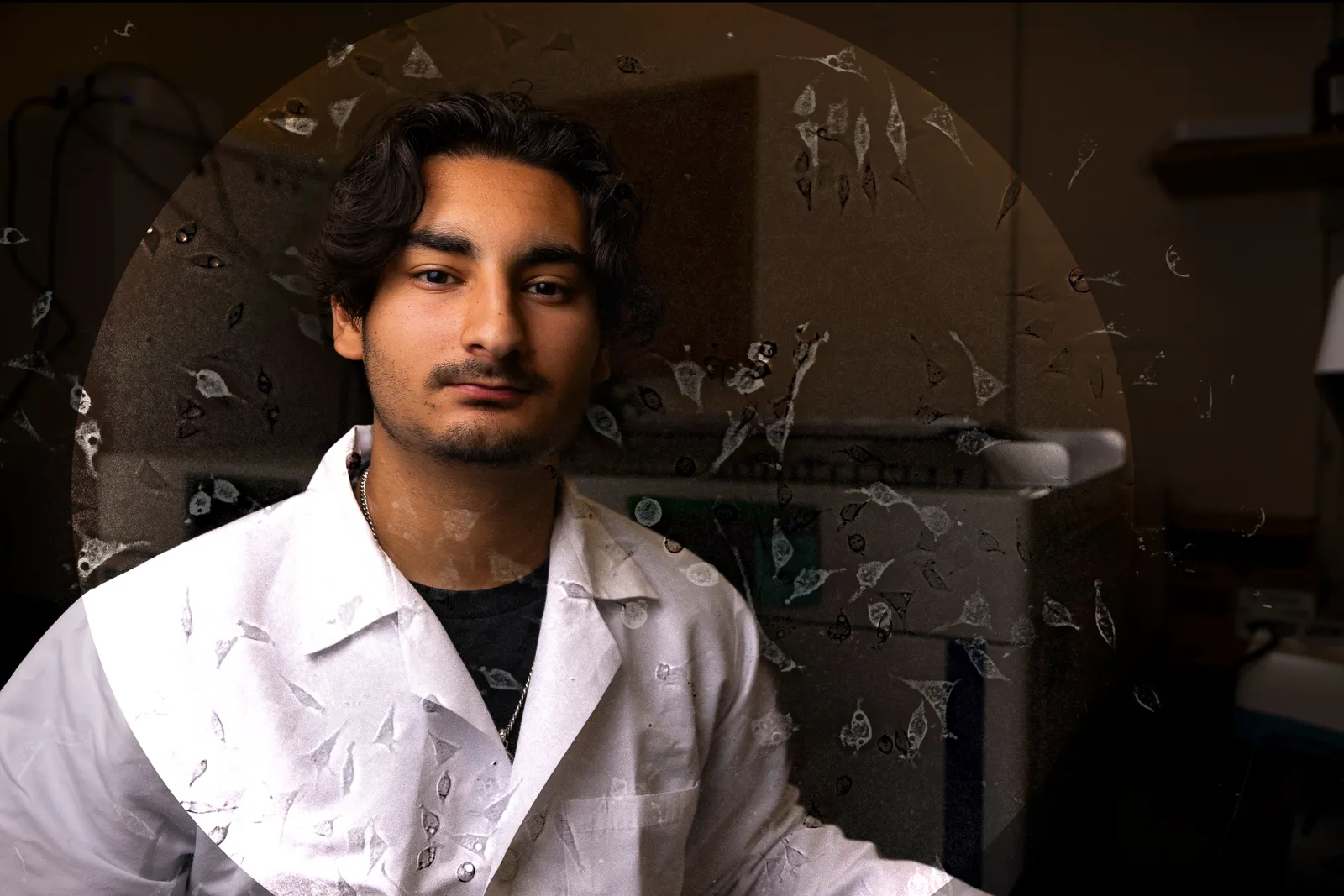 Texas Tech undergraduate student Sy Bogutski sits in the lab. This image is a composite with an image of cancer cells from his microscope.