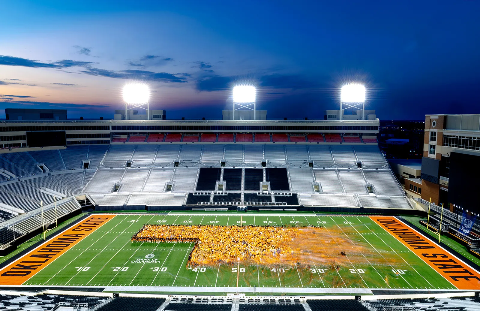 The Oklahoma State Class of 2029 leaves the stadium after taking a class photo in the shape of Oklahoma at the Boone Pickens Stadium at Oklahoma State University in Stillwater on Sunday, Aug. 17, 2025. During the editing of this photo, generative fill was used to remove small items on the sidelines. Along with a small cleanup on the edges, generative fill, the stamp tool, and the healing brush were used to clean up the stadium seating.