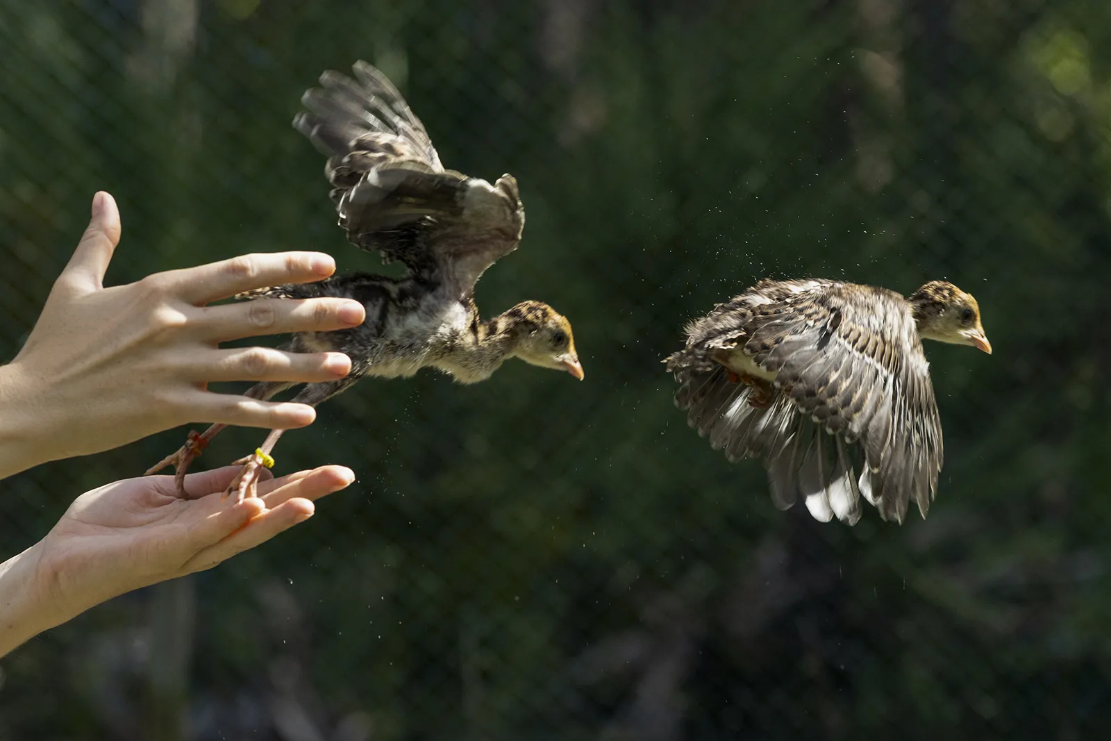 A two image composite photo of a two-week old turkey poult taking off from the hand of Wildlife Ecology and Conservation post doctoral student Kelly O'Neil in one of its first flights on June 26th, 2025.