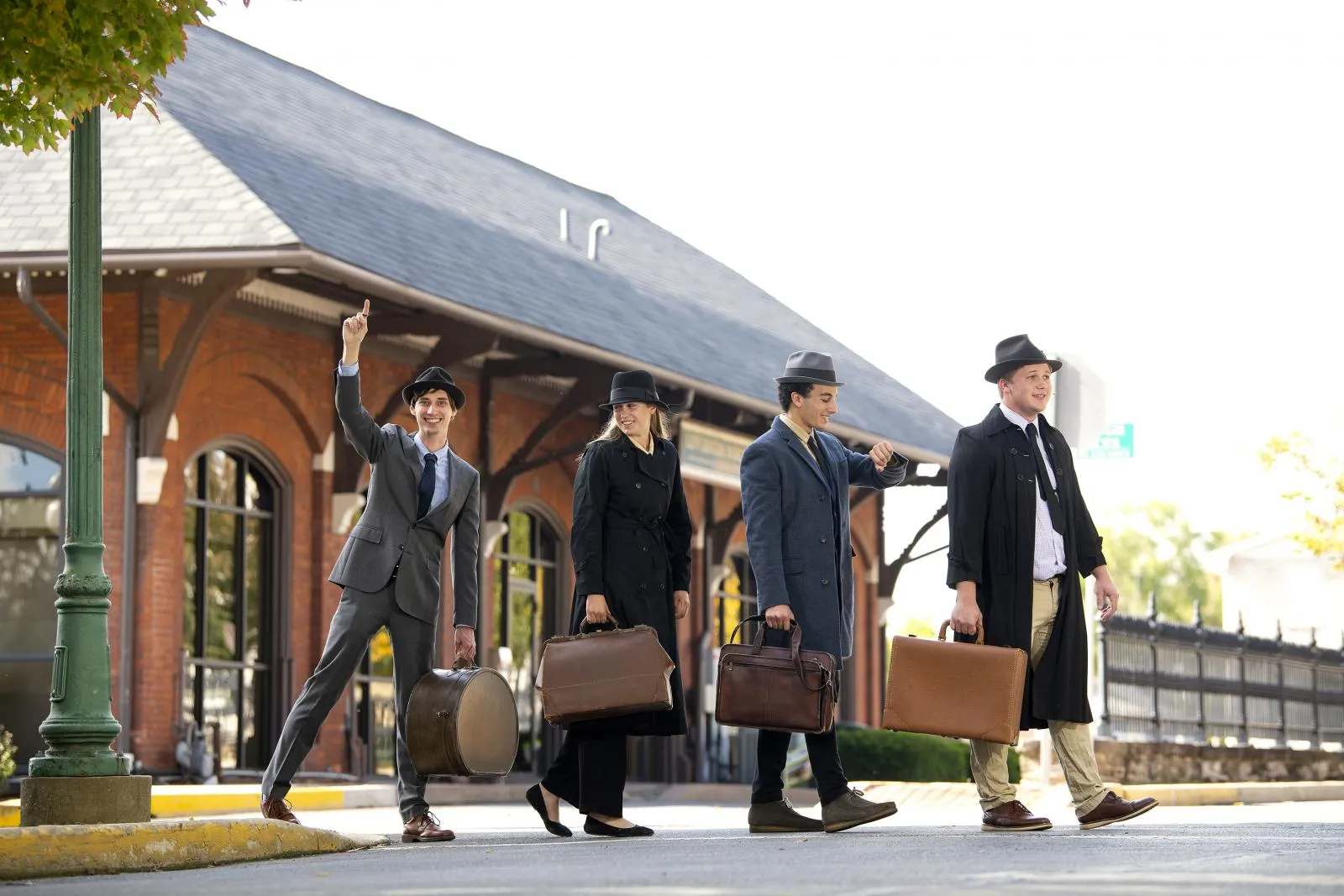A professor and three of his students dressed as traveling salesman in front of the old train station in town for a fun way to illustrate for the magazine the traveling salesman problem which they are researching together.