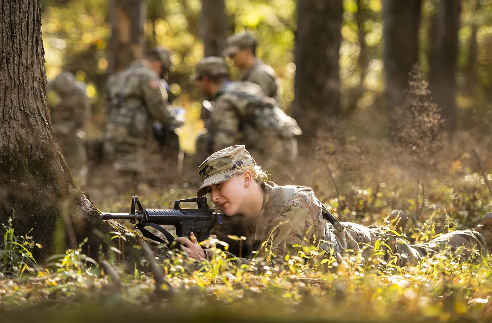 A ROTC cadet looks through their gun sights during a ambush training exercise.