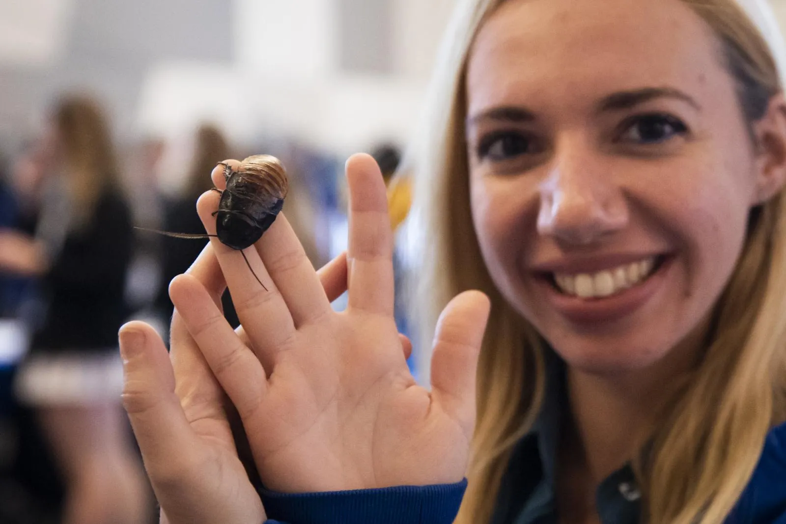 An attendee holds a large cockroach during the Curiosity Fair.