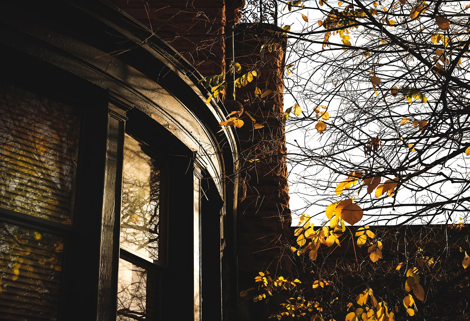 A window of the historic Samuel Cupples House reflects fall leaves on October 27, 2022.