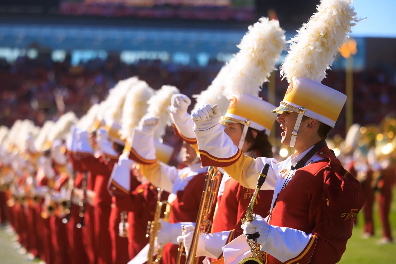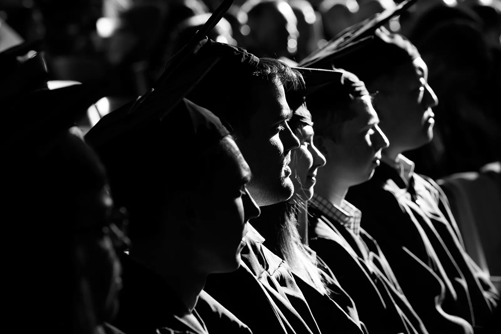 School of Business students are backlit by the afternoon light as they wait to graduate.
