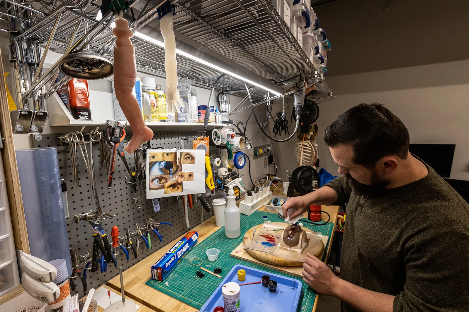 Damon Coyle works for the Sheldon Clinical Simulation Center creating lifelike trainers for medical, nursing and vetmed students to bridge the gap between training and real life. Here, he's painting bruising on an ocular trauma trainer.