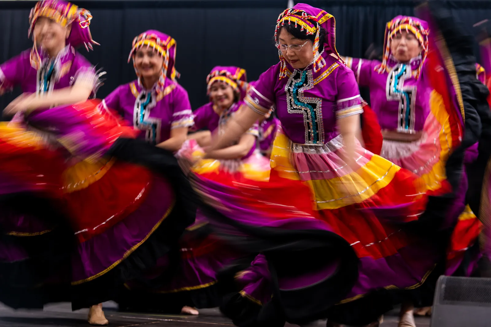 The movement of the Blue Moon Dance Troupe is captured during the 46th Annual International Festival as the performers deliver a traditional Tibetan inspired dance.
