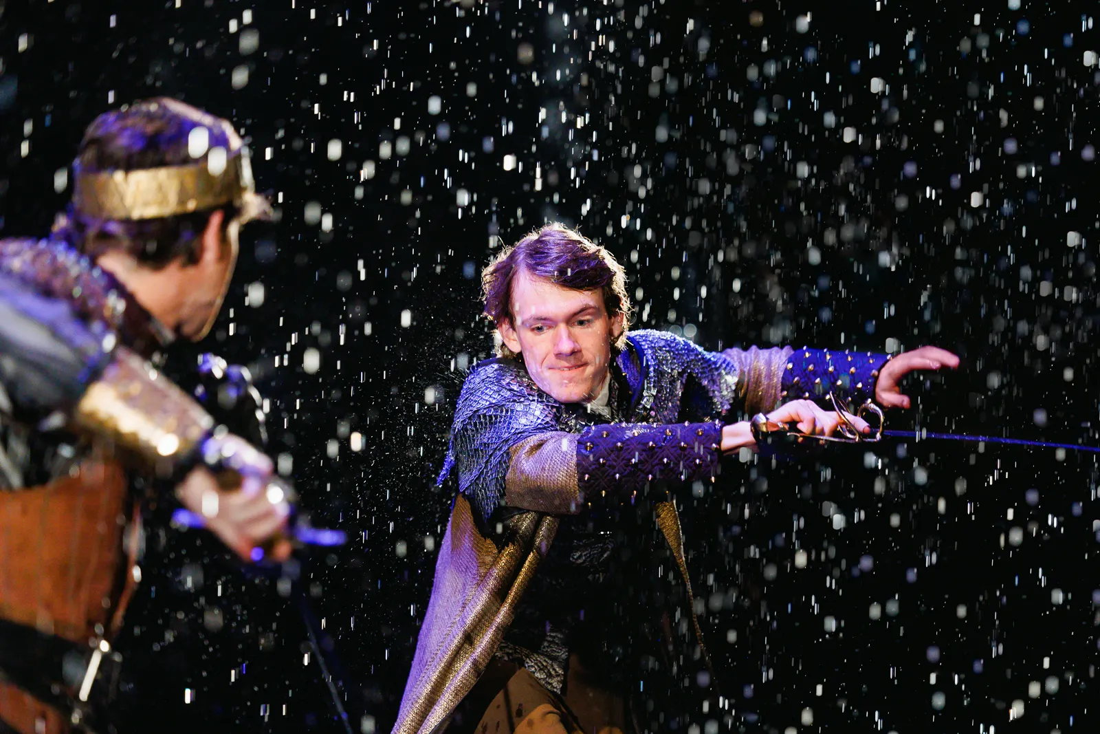 In the university production of Richard III, the climactic end battle includes a battle in rain on stage.