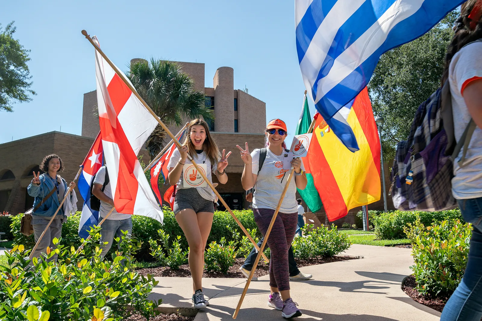 Students pose with V's up during the International Meet & Greet parade of flags.