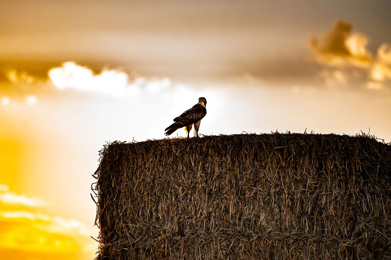 A hawk rests on a bail of hay at the Chico State University Farm.