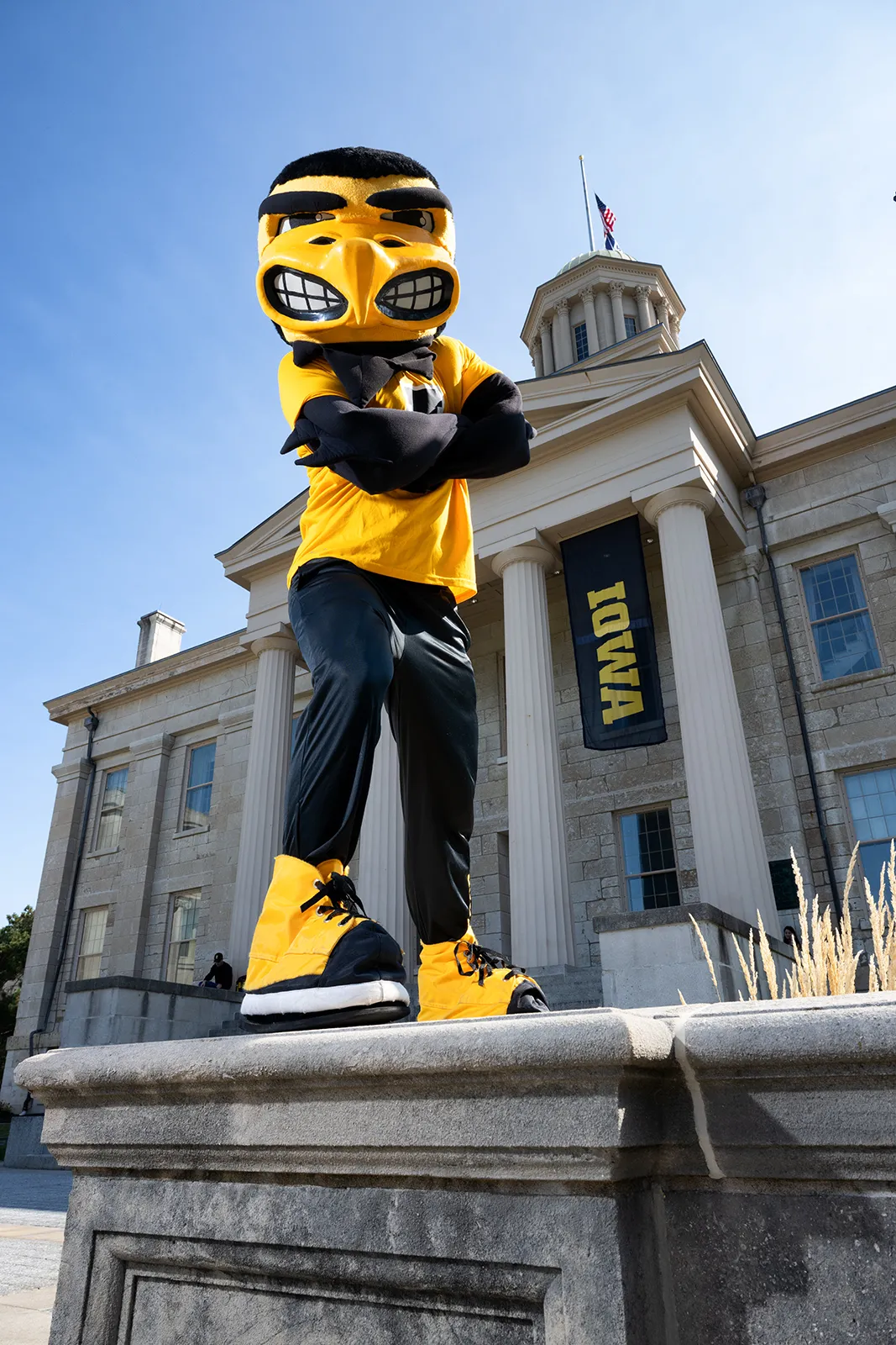 The university mascot strikes a pose in front of the campus centerpiece building