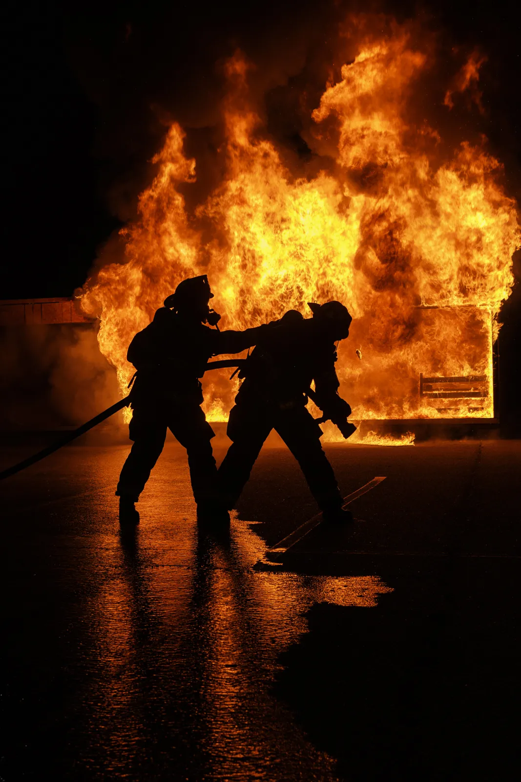 Two firefighters prepare to extinguish the flames of a structure fire during the Up In Flames fire safety event on campus. The local fire department builds a 3 dorm room structure and sets it on fire to show how quickly fires can spread in a dorm room that does not have a fire suppression system.