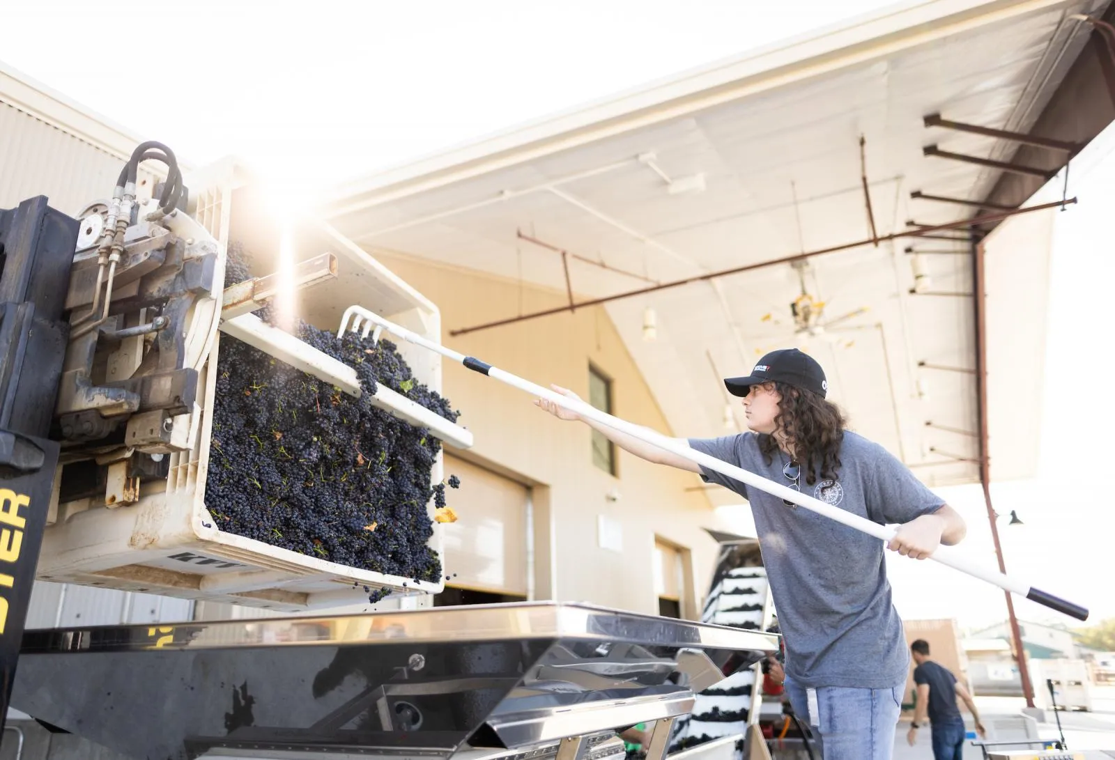 Students process pinot noir grapes freshly harvested from the university's vineyard.