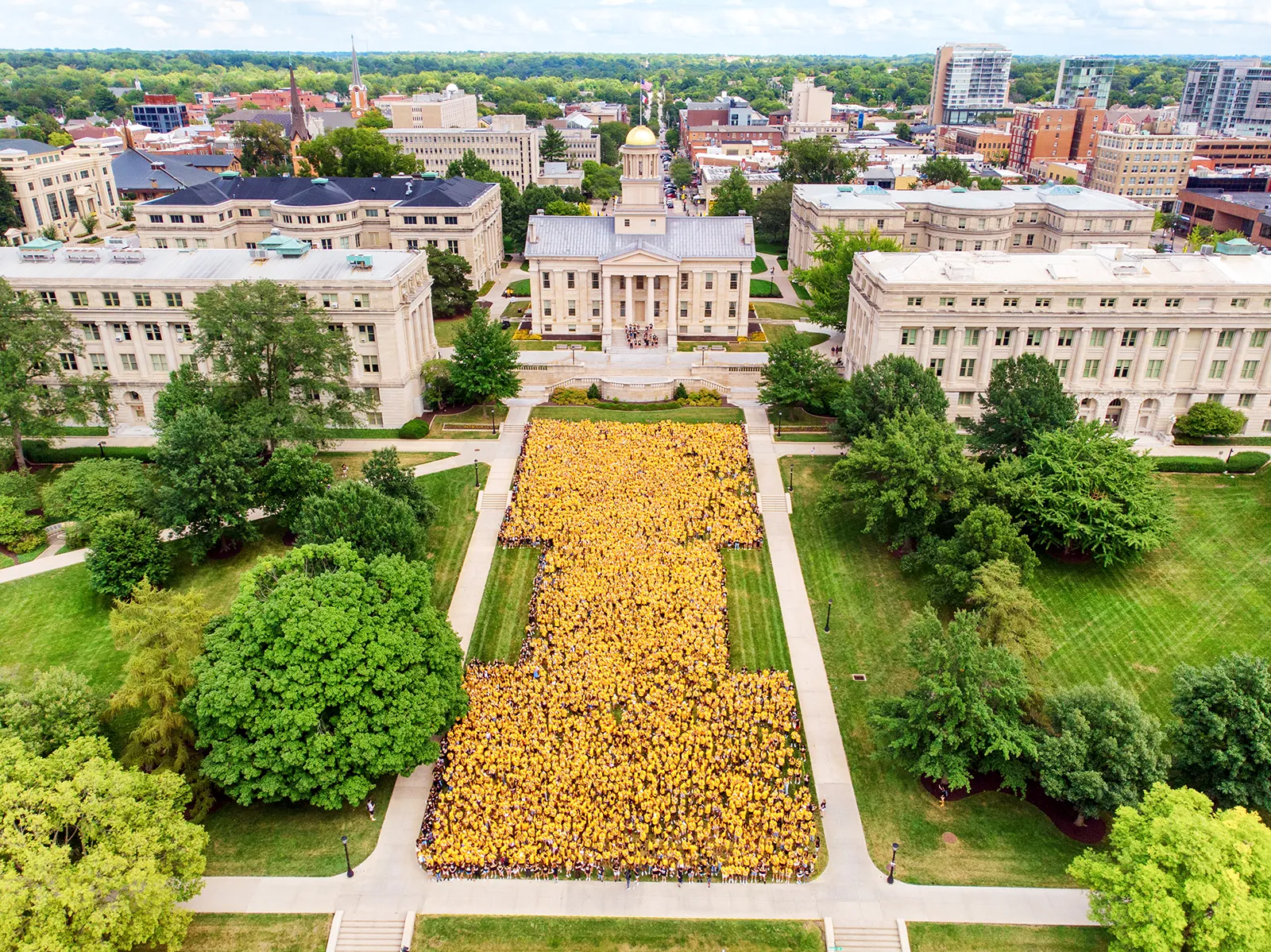 Students form a Block "I" for the Class of 2026 photo on the Pentacrest