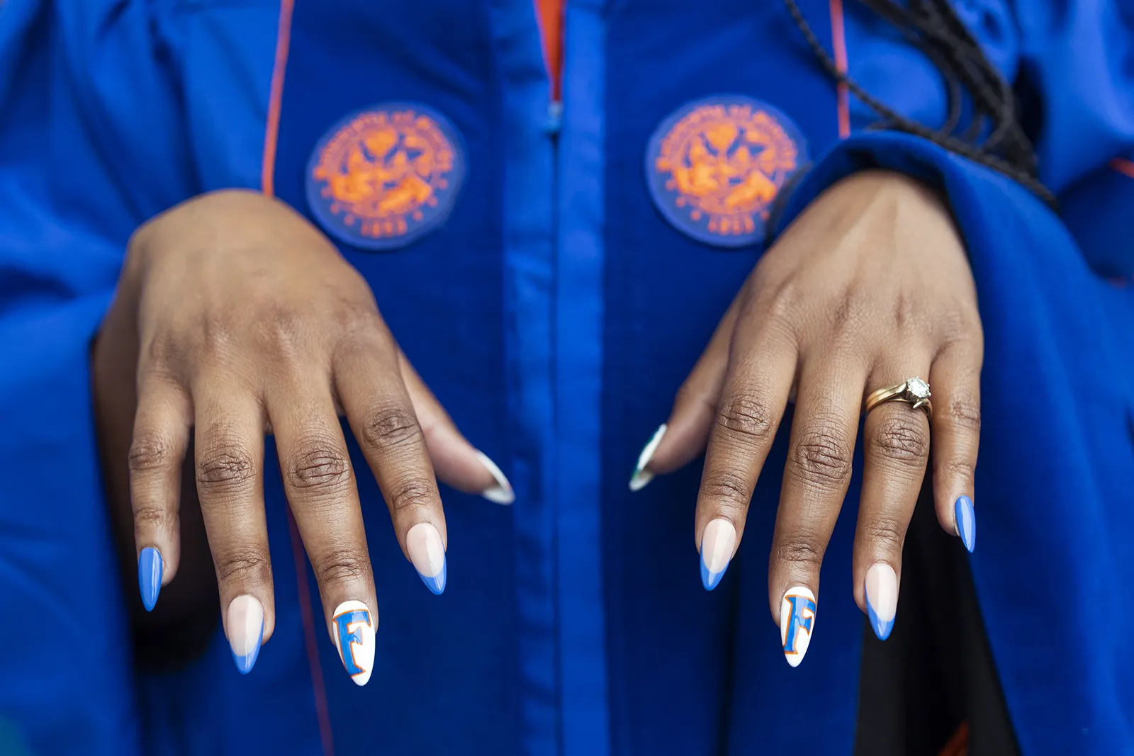 A Ph.D. graduate shows off her nails before walking in summer commencement. Photo taken 08-05-22.