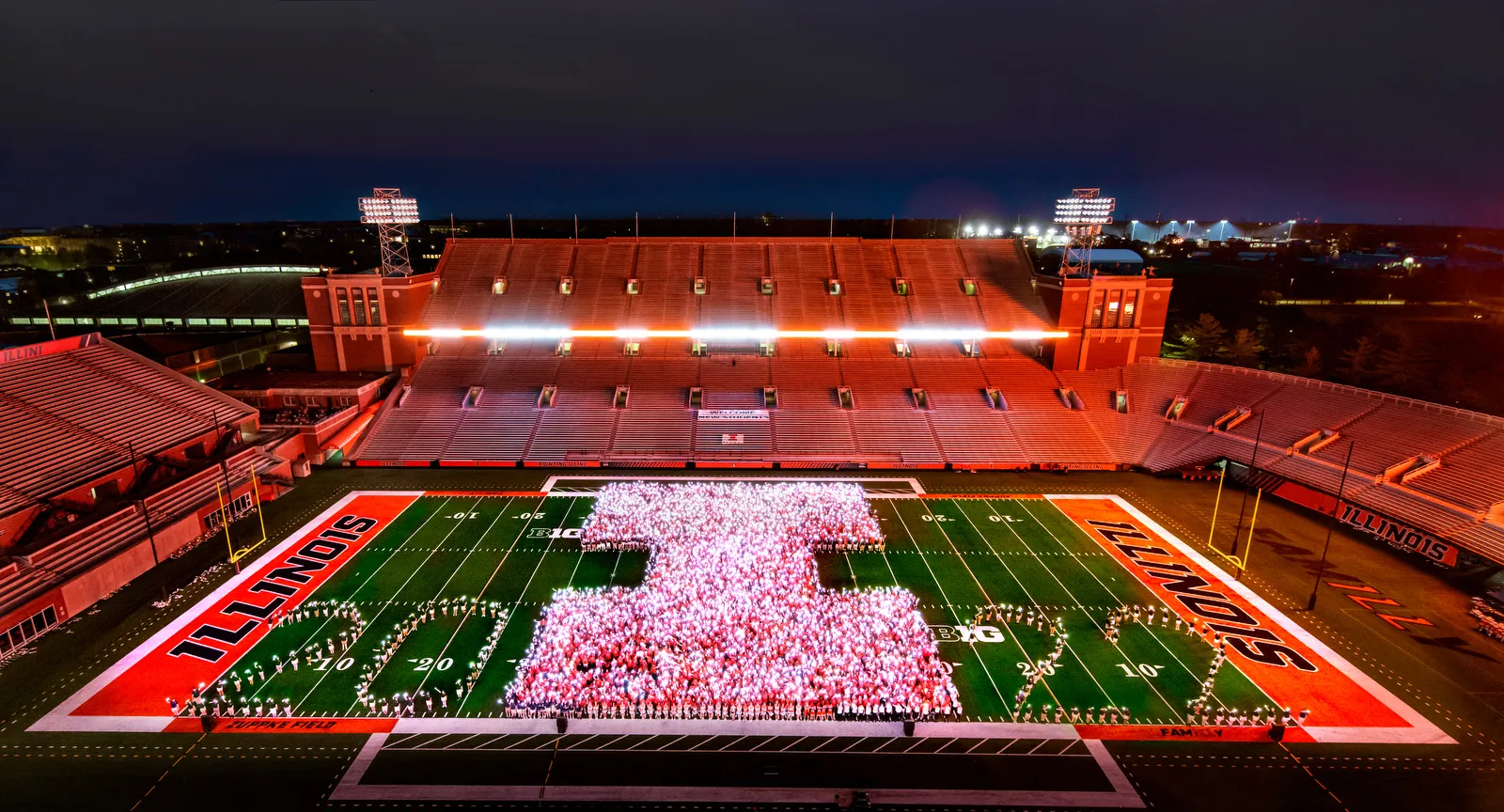 The incoming student class of 2022 raise their cell phones as they form a Block I on the field of Memorial Stadium.