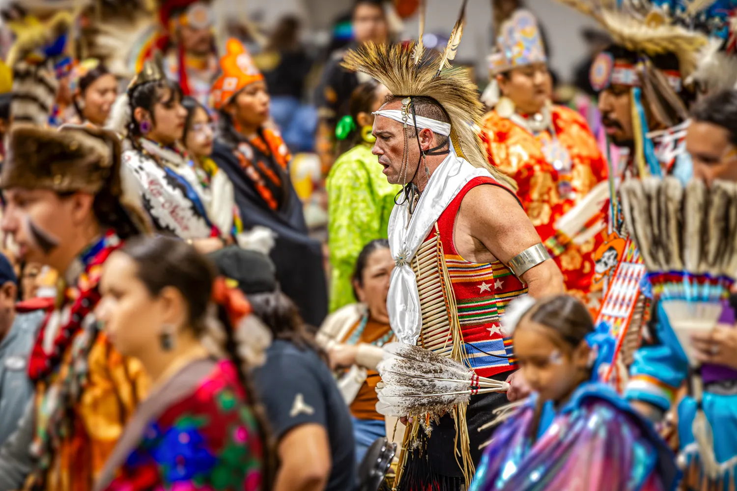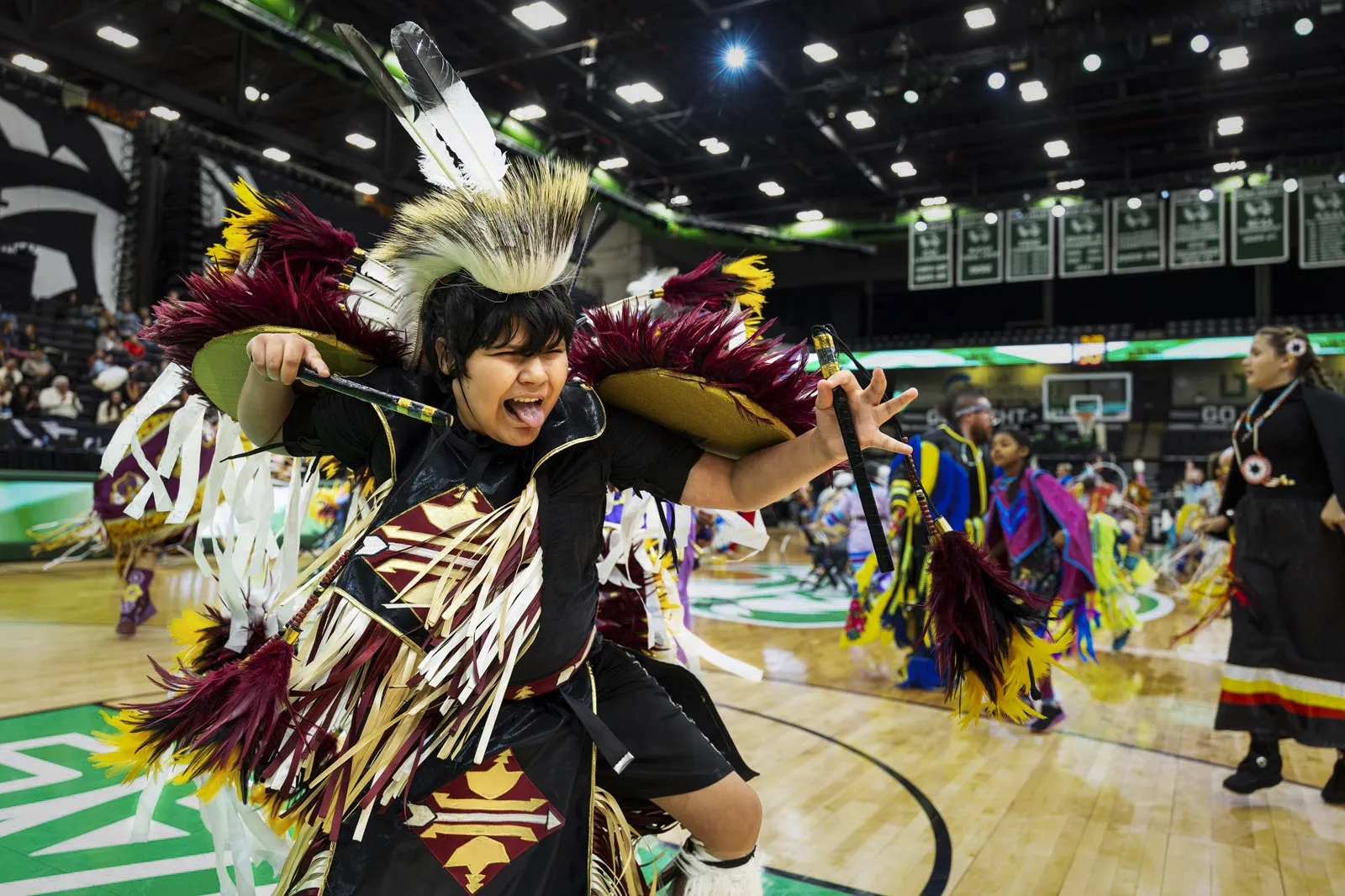 Celebrating Native American Heritage Month, A young traditional dancer performs with nearly 50 other Native American dancers during the halftime of the men's basketball game.