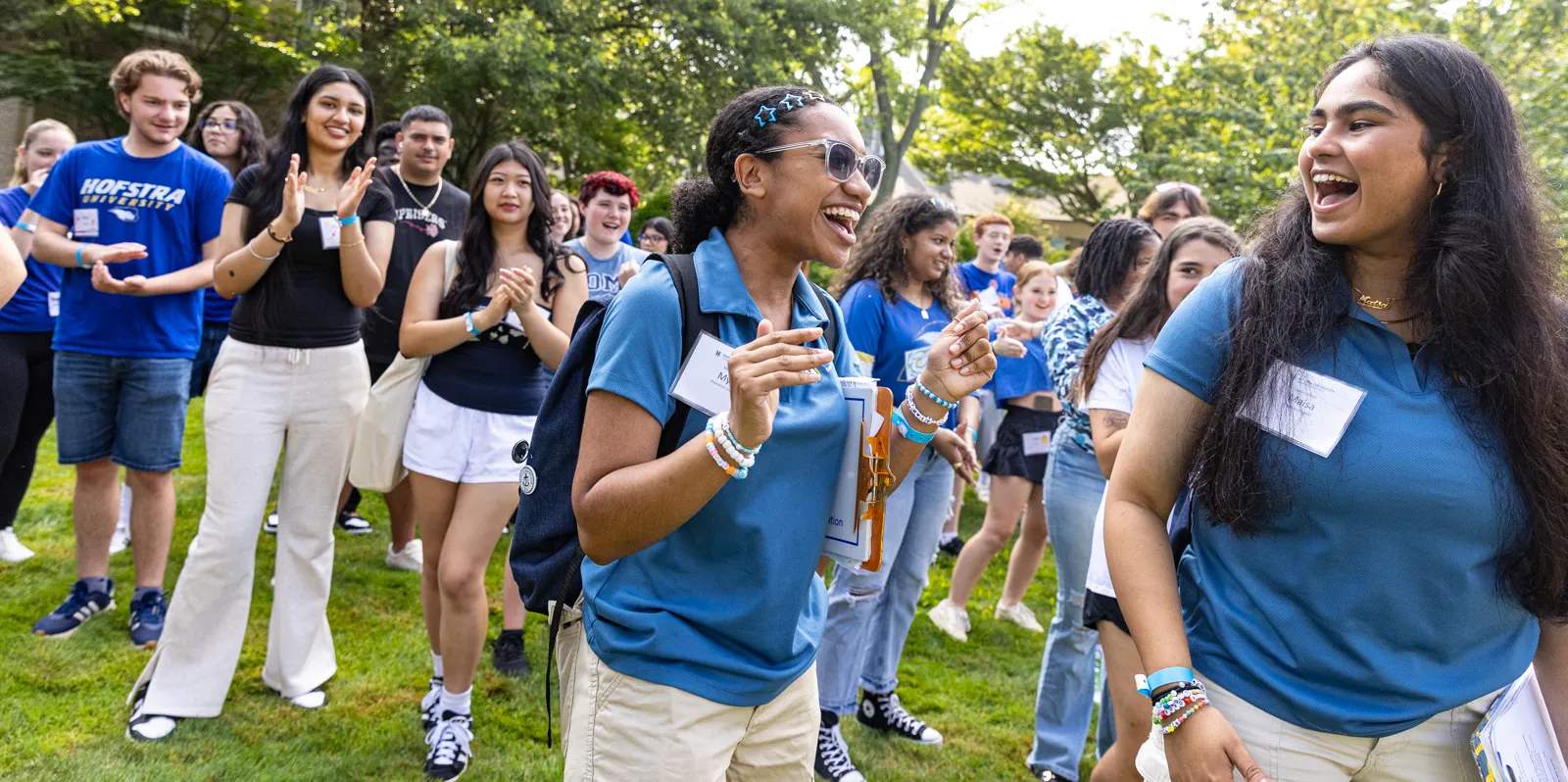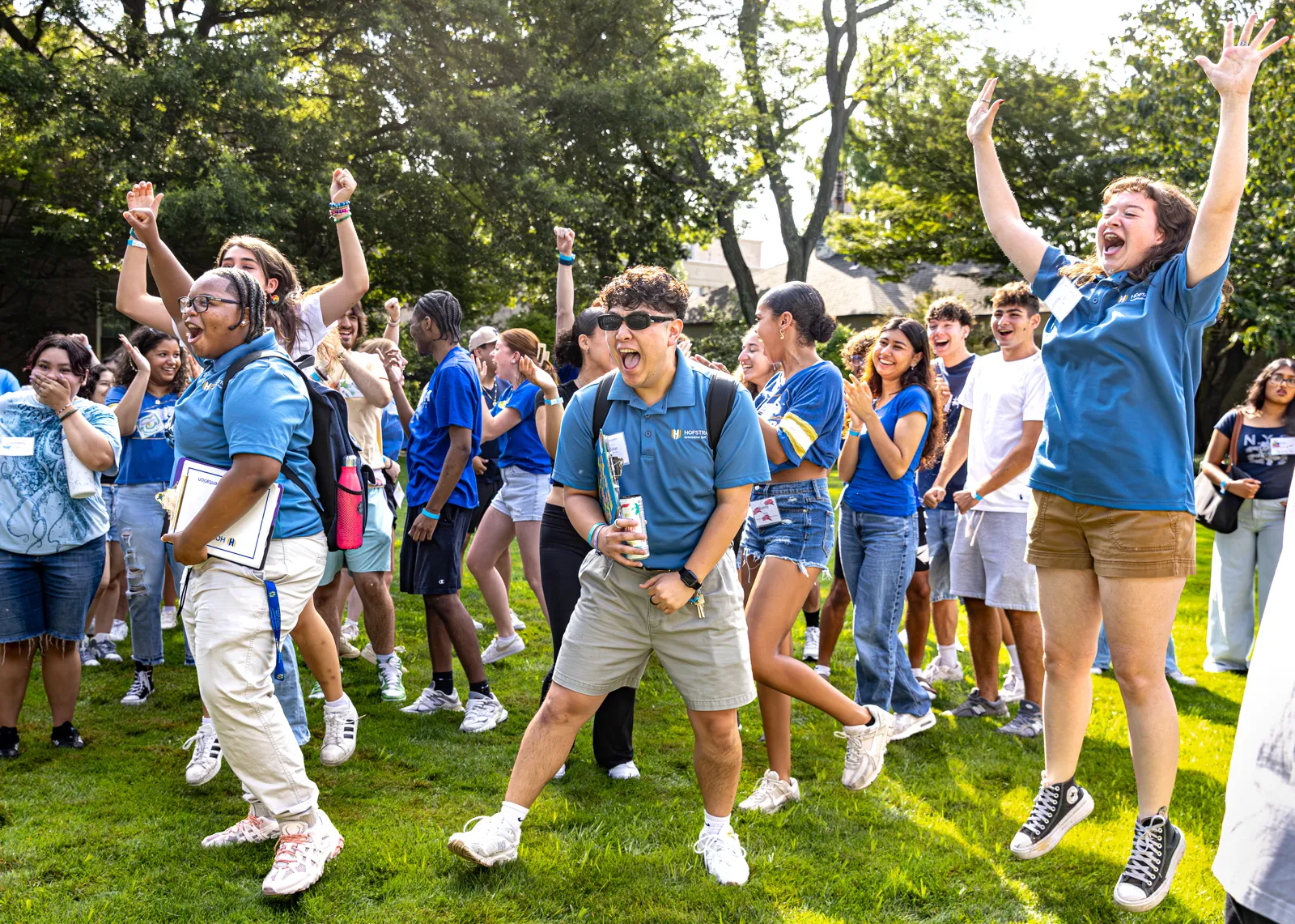 Summer Orientation Leaders celebrate their Rock, Paper, Scissors team's victory with incoming freshman on July 9, 2025.