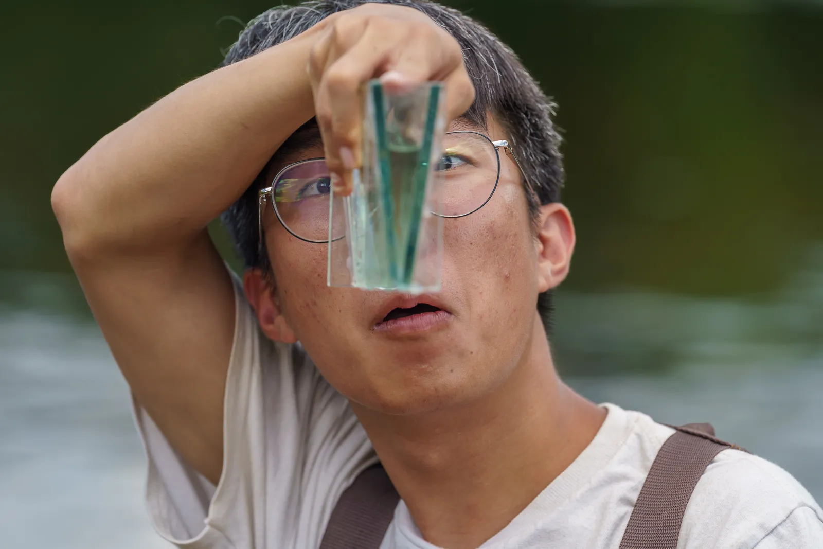 Third year Andrew Kim examines a fish from the New River during a trip with the Field Biology of Fishes course on Tuesday, July 8, 2025.