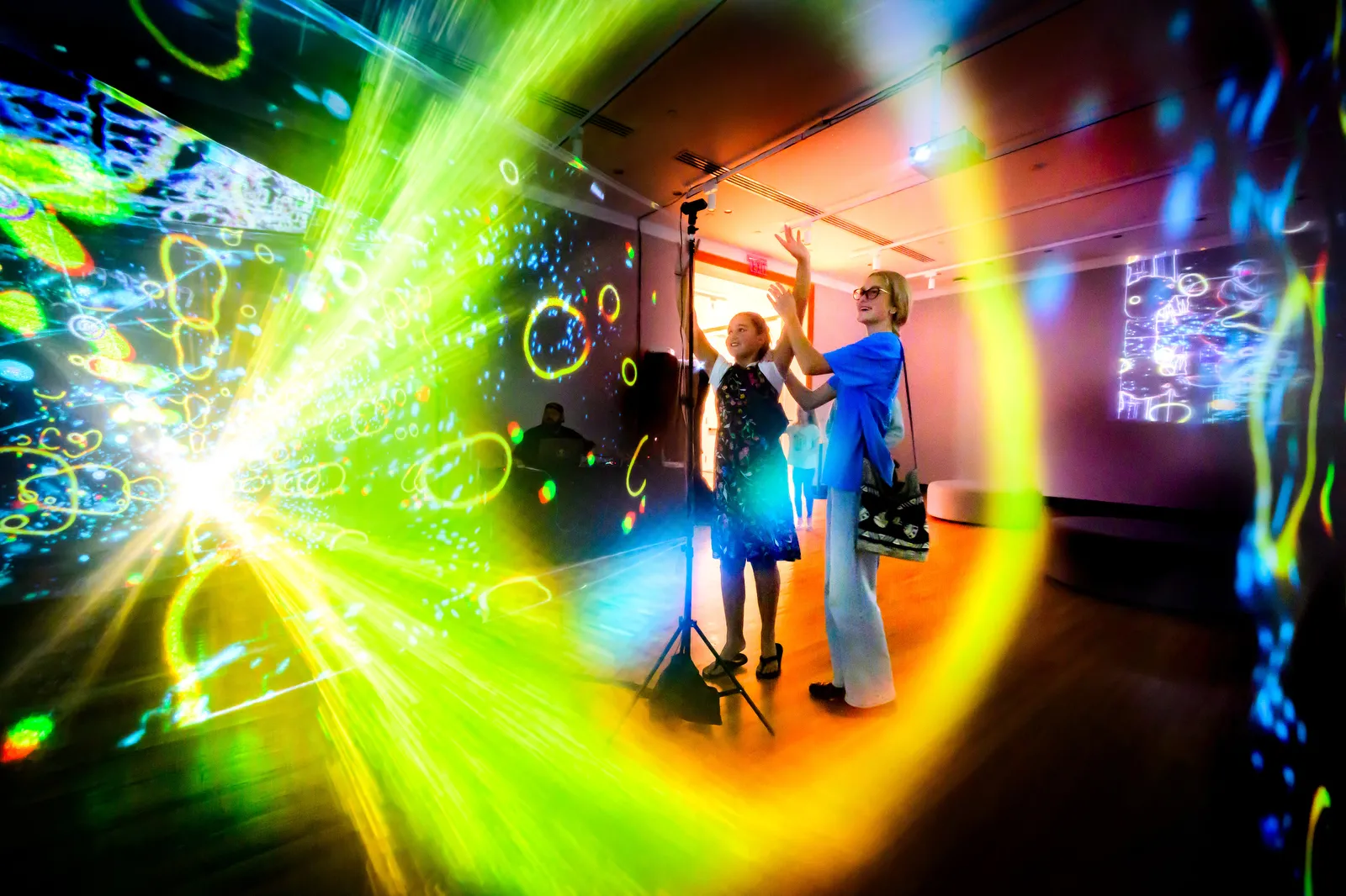 Inspired by projected imagery flowing around them as a trance beat plays, students spontaneously start to dance to the music during KAM Fest at Krannert Art Museum