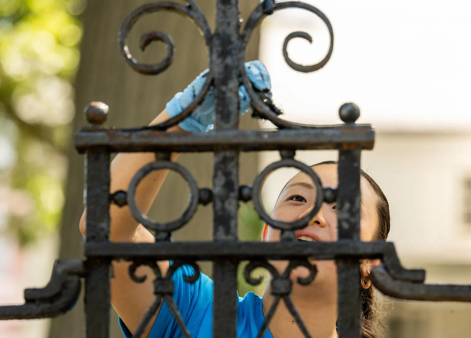 First Year Student Outreach Project (FYSOP) participant Grace Lee (CAS’28) paints the gate surrounding First Parish Church August 28. The all day service program for this group included preparing classroom for the start of school next door, weeding on the properties and painting picnic tables, curbs and directional signs on the concrete.