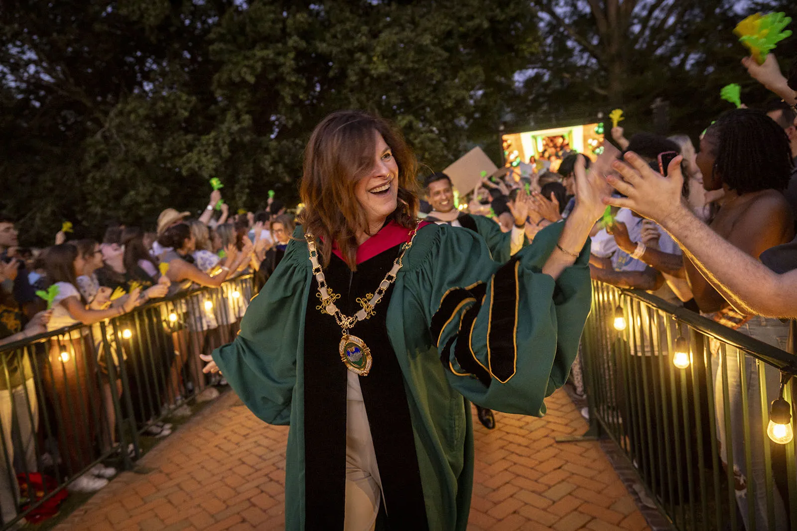 The university president shares hi-fives during the 2025 convocation ceremonies.