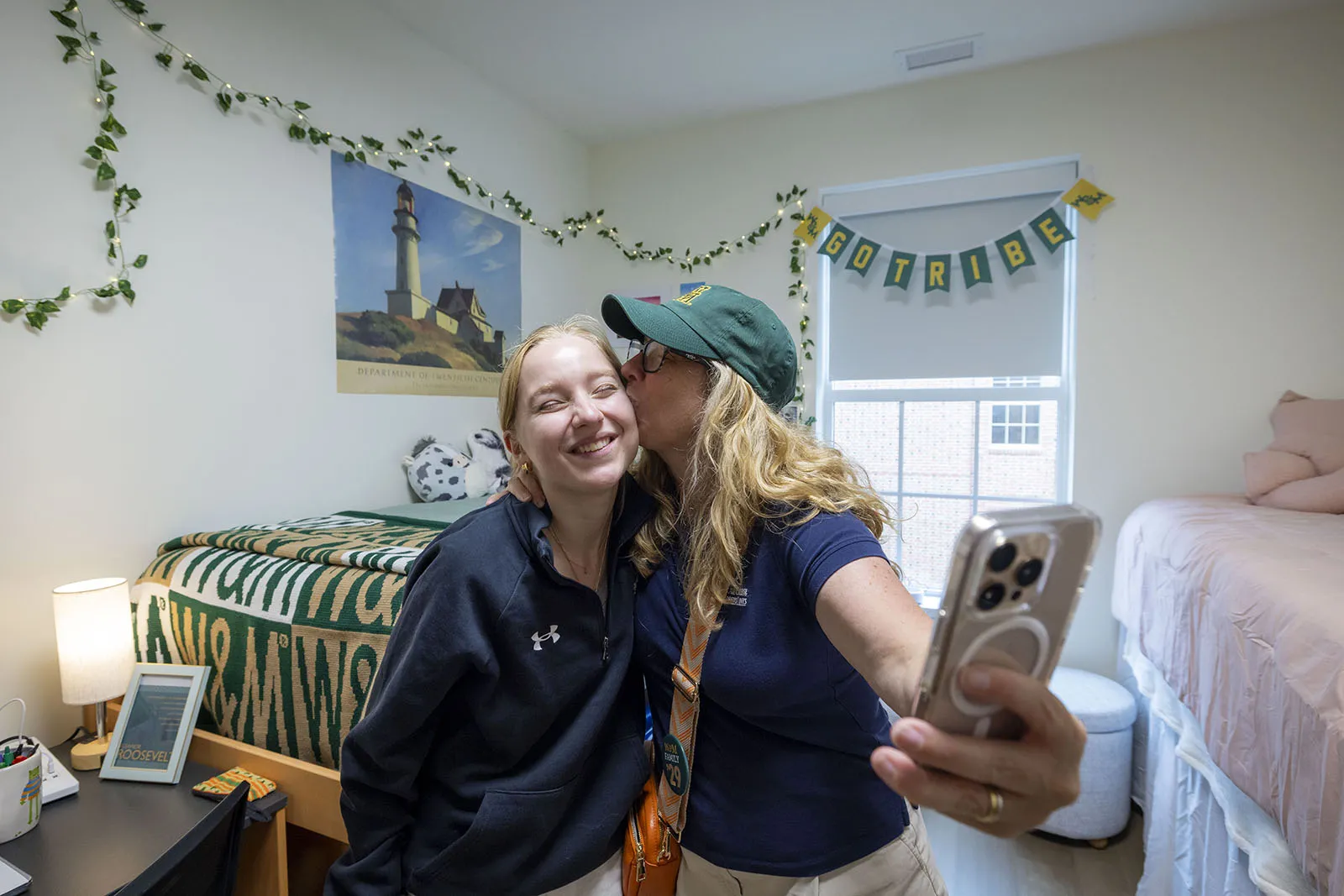 A mother and daughter share a moment in her room after moving into the first year dorm.