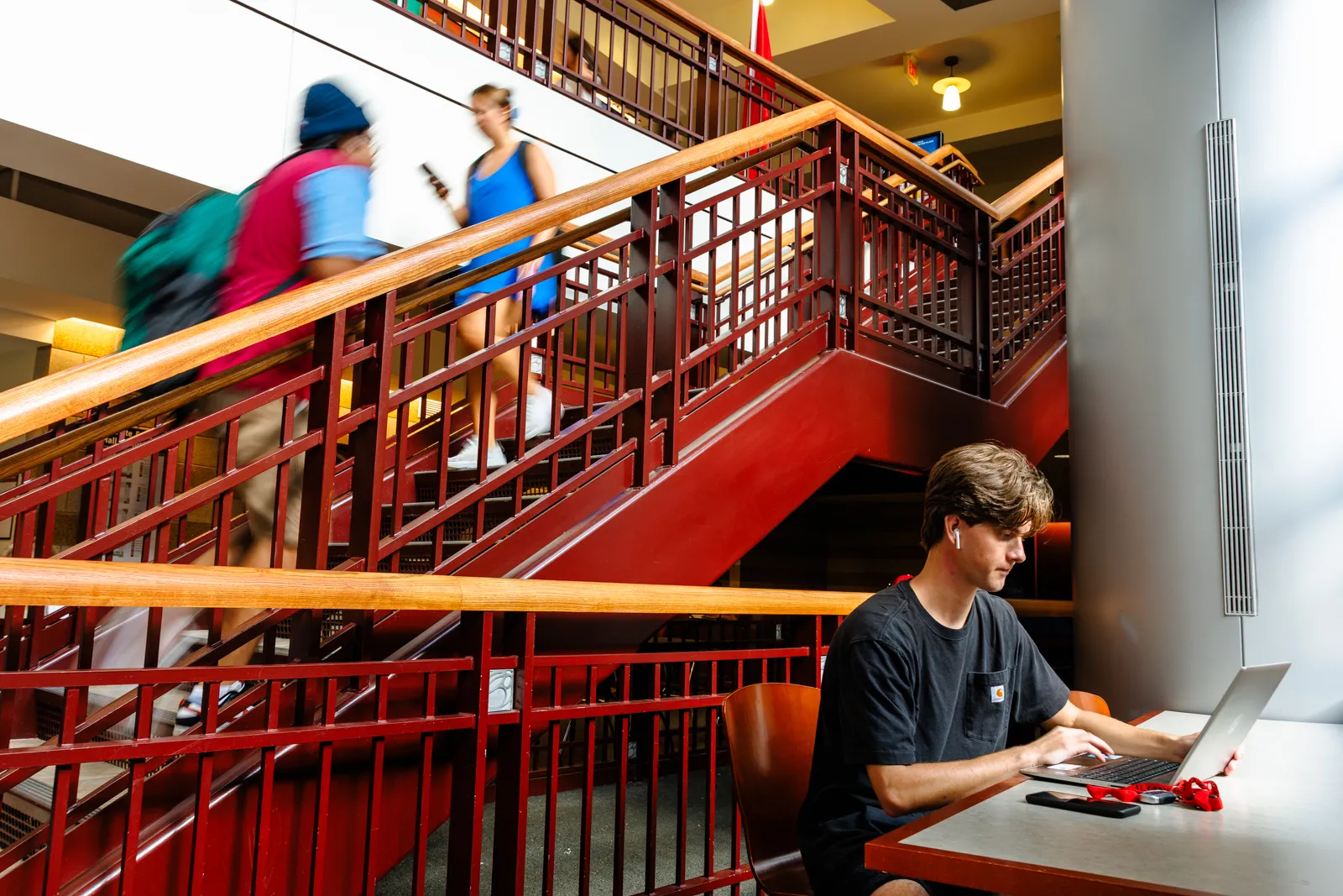 A student studies in the lower lobby of the College of Business while other students walk up and down the stairs to their first day of classes.