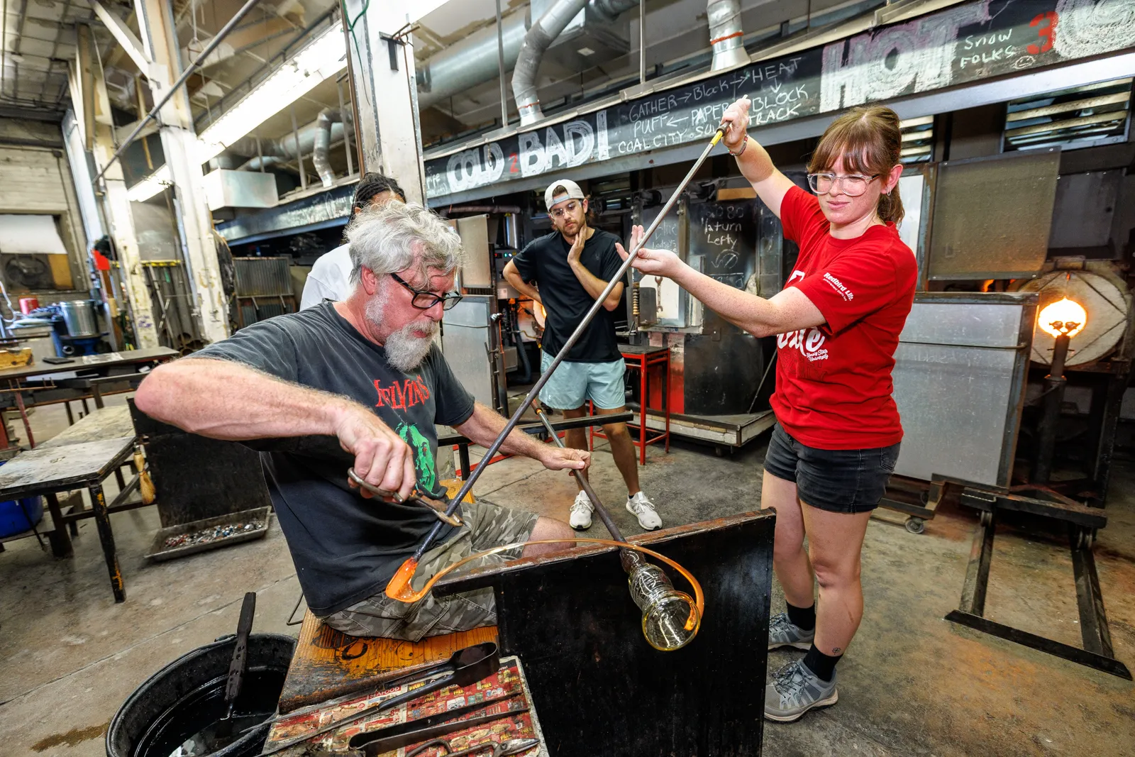 Professor John Miller gives a glass blowing demonstration to his glass blowing class during their second course session.