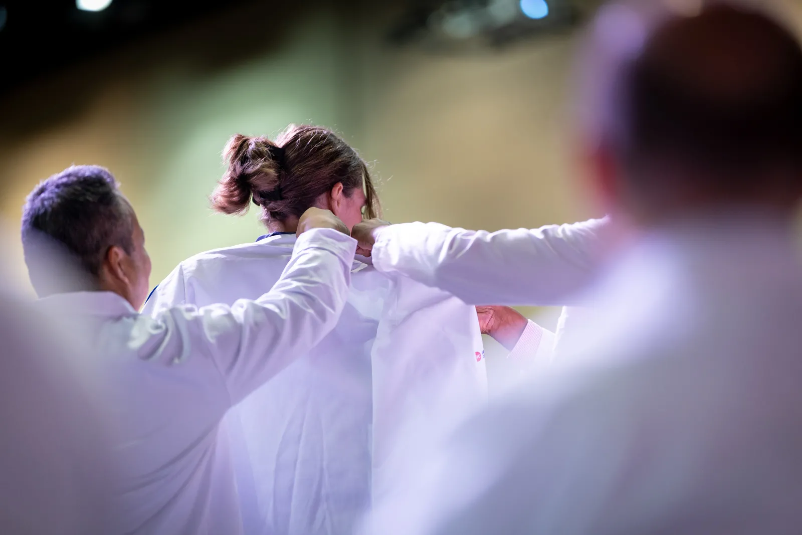 Medical student receives their white coat on stage at the UIC College of Medicine White Coat Ceremony on Friday August 15, 2025