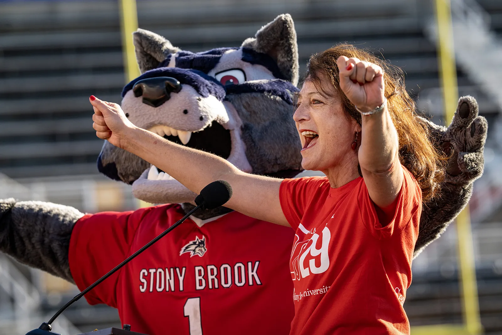 Stony Brook University President and Wolfie greet the new incoming Freshman at the annual Welcome Convocation.