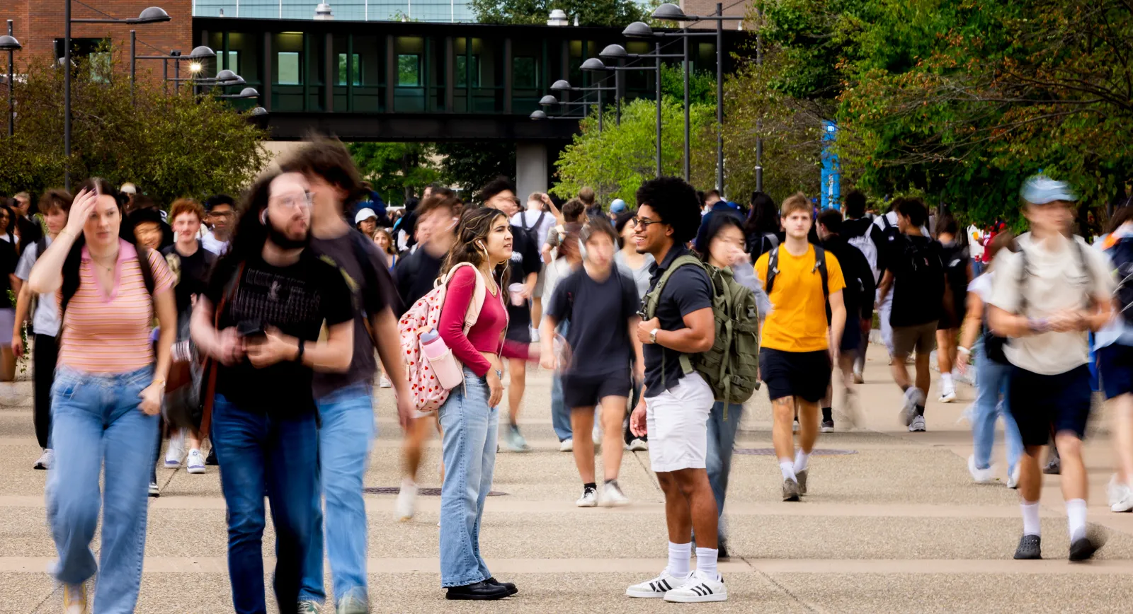 Two students stop to chat while others walk around them on the Promenade on the first day of classes for the fall semester in August 2025.