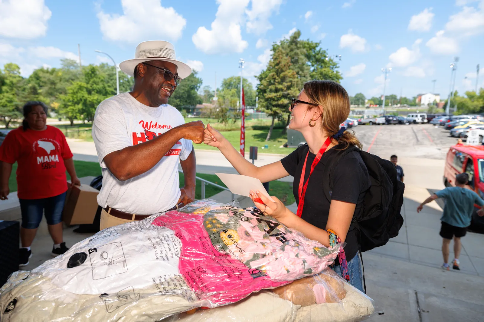 University President Aondover Tarhule welcomes an ISU student moving into the dorms before the start of the Fall semester.