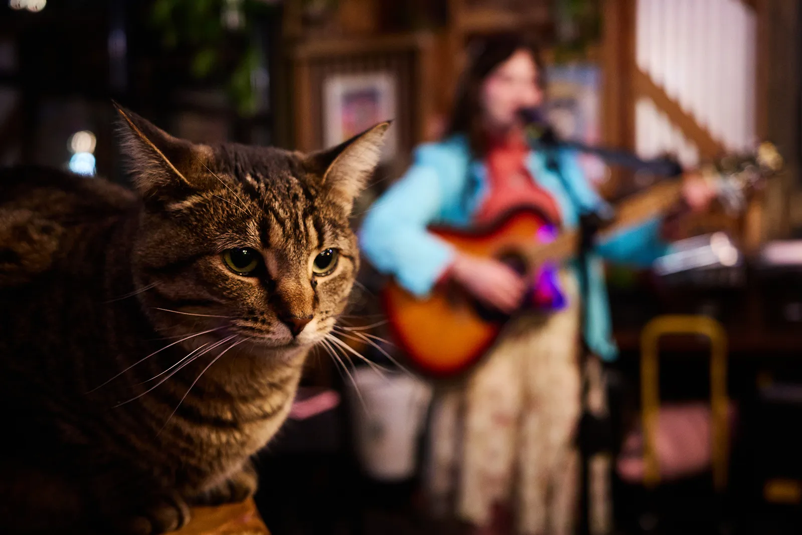 A cat sits in front of local musician, Laura Switzer as she performs during The Songwriter Sessions.