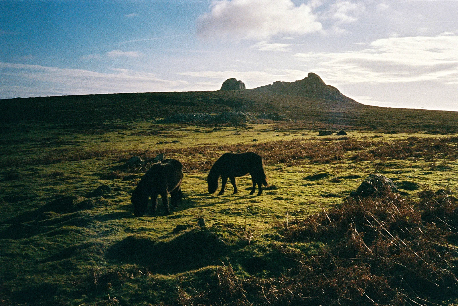 A pair of Dartmoor ponies graze in front of the imposing silhouette of Hay Tor, Darmoot National Park. Shot on Kodak ColorPlus film with a Canon Sureshot point and shoot camera.