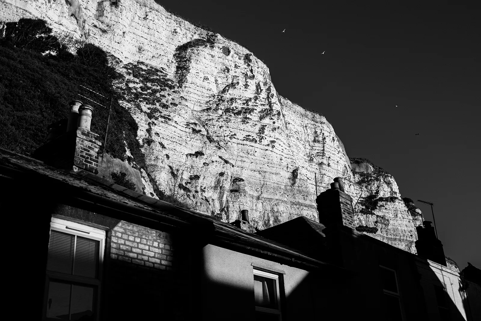 A section of The White Cliffs of Dover dwarfs the houses in the town below.