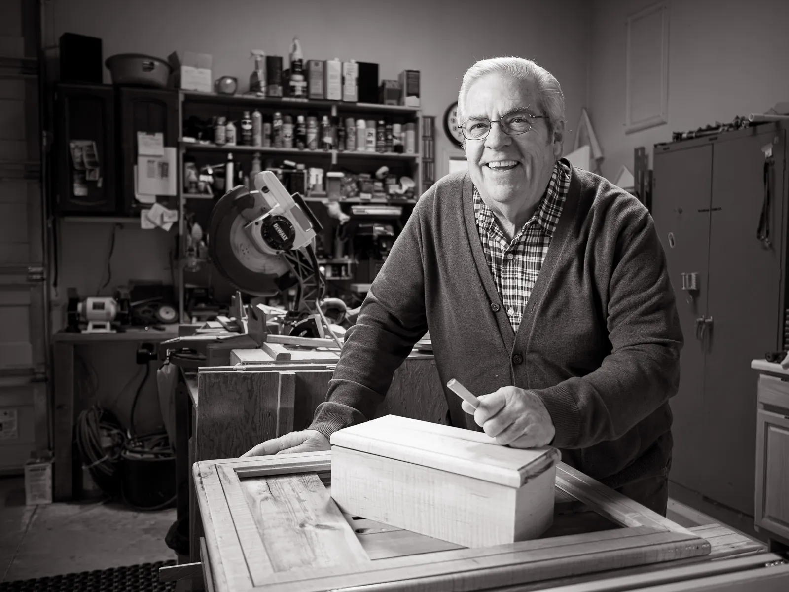Dennis is a character -- incredibly particular, but also magnanimously generous. He's got it in his mind that he won't be around much longer, so he wanted me to make a portrait of him in his suit (ya know, for the funeral -- which isn't pending). I agreed -- as long as he'd also let me make a photo of him in the shop where he spends so much time making things for others. I drove across the state and made a few photos, including this one that shows who he really is.