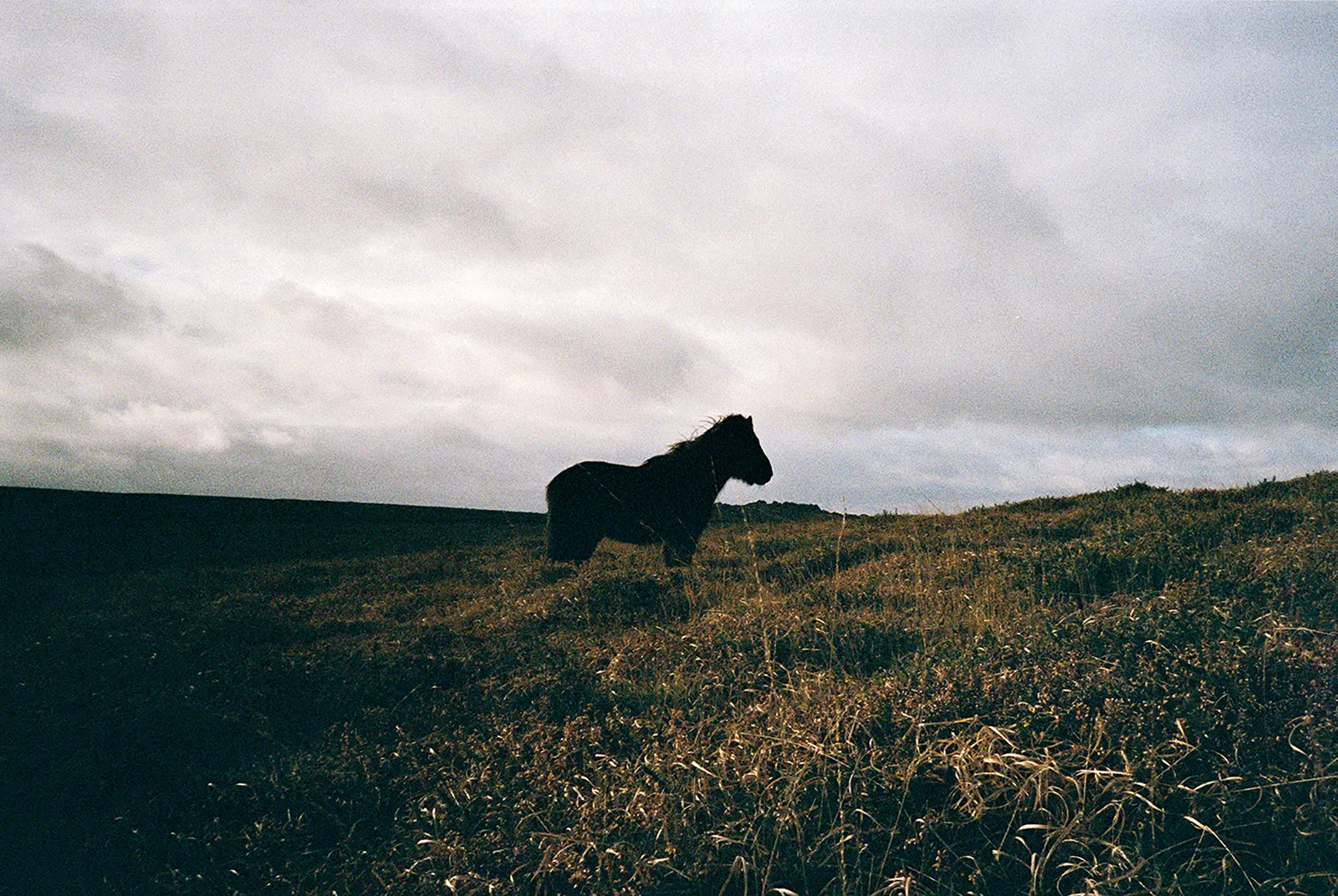 A lone wild Darmoor pony stands stands peacefully in the rugged and desolate landscape of Dartmoor national park. Shot on Kodak Colorplus film witha Canon Sureshot point and shoot camera.