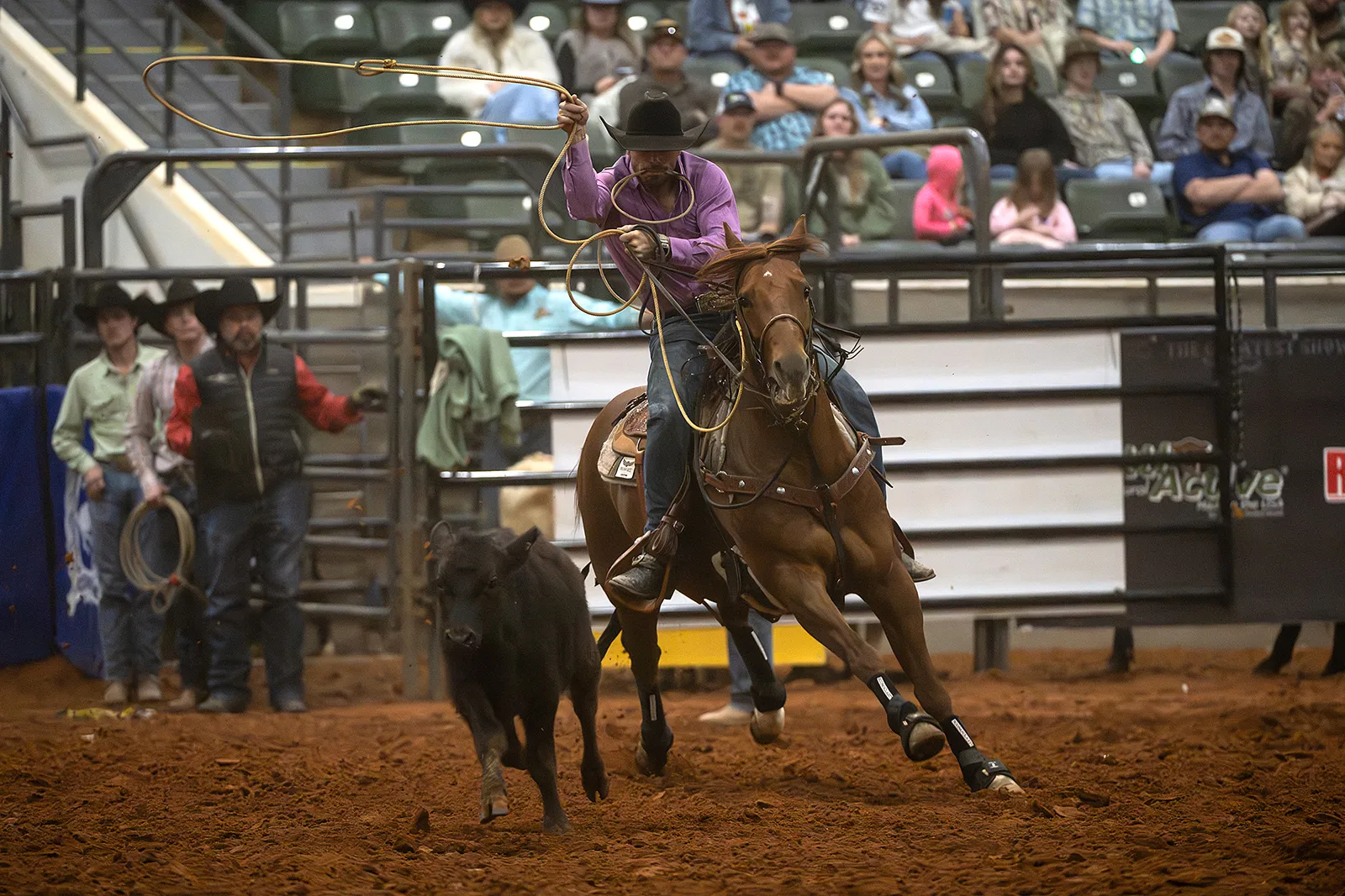 In the excitement of the moment, didn't take long for this cowboy to lasso, catch and wrestle the calf to the ground.