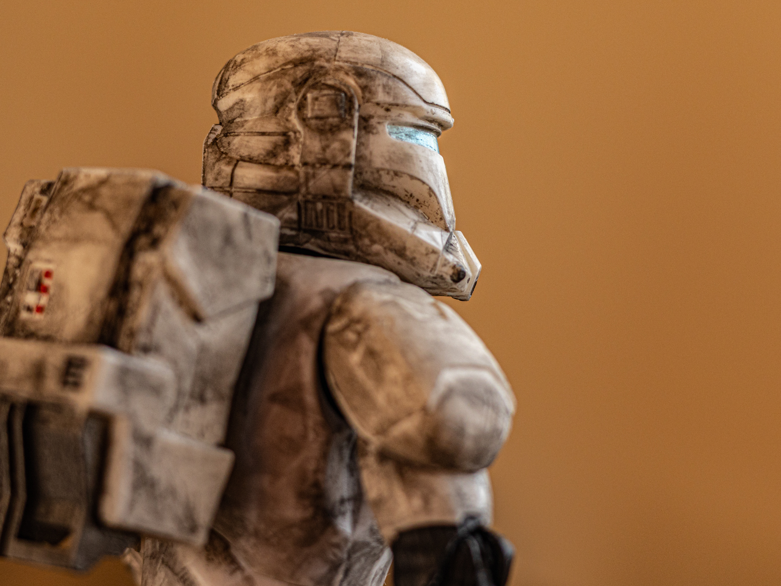 Star Wars action figure photographed on my dining room table, lit with one bounced speedlight. White balance adjusted in-camera to create the desired temperature. Photographed on June 1, 2024.