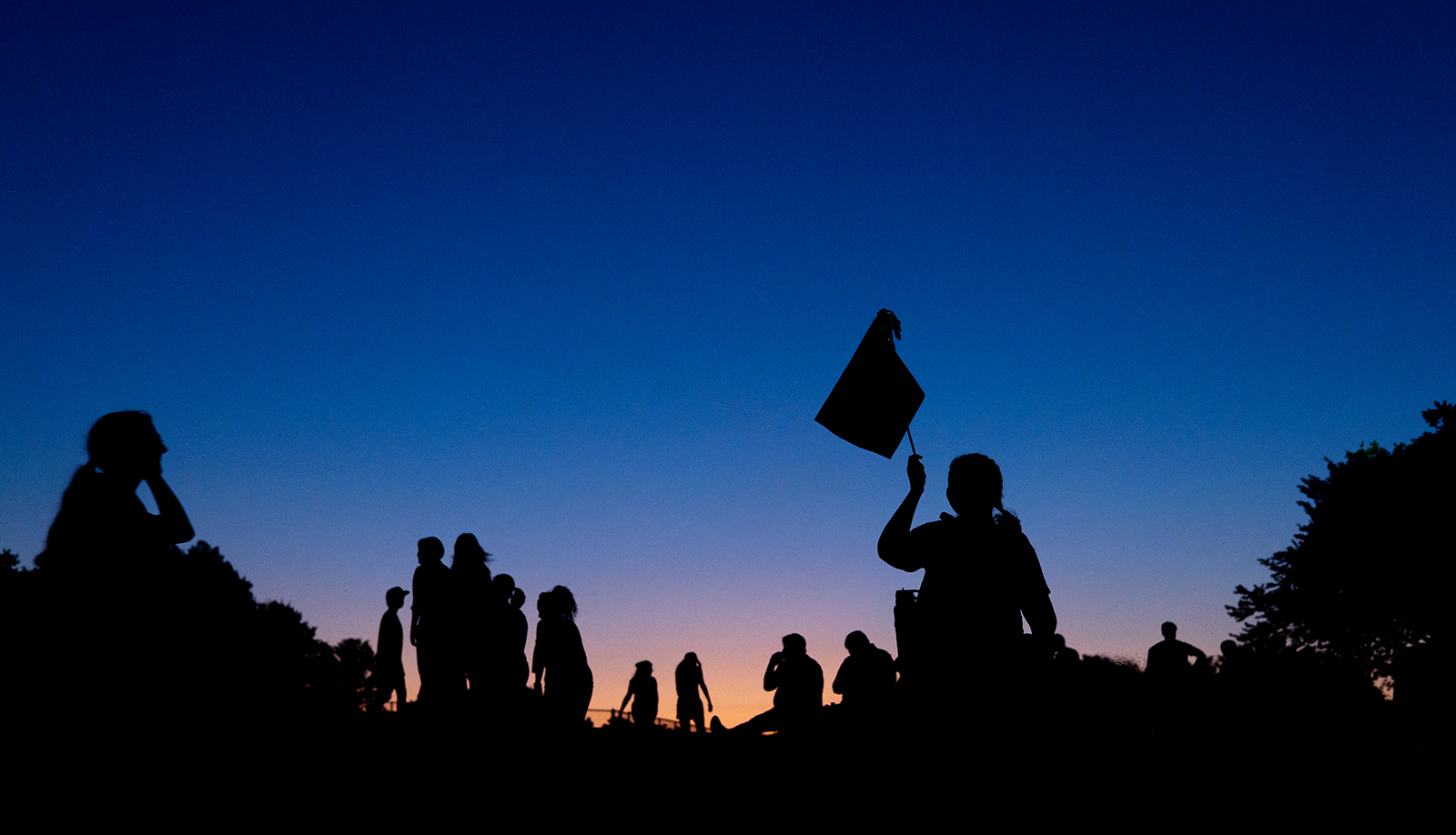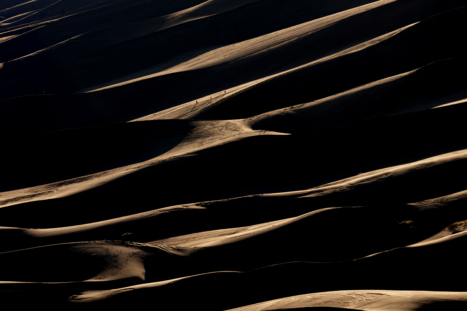 Hikers are silhouetted in a landscape of shadows and sand while hiking to the top of a sand dune in Grand Sands National Park.