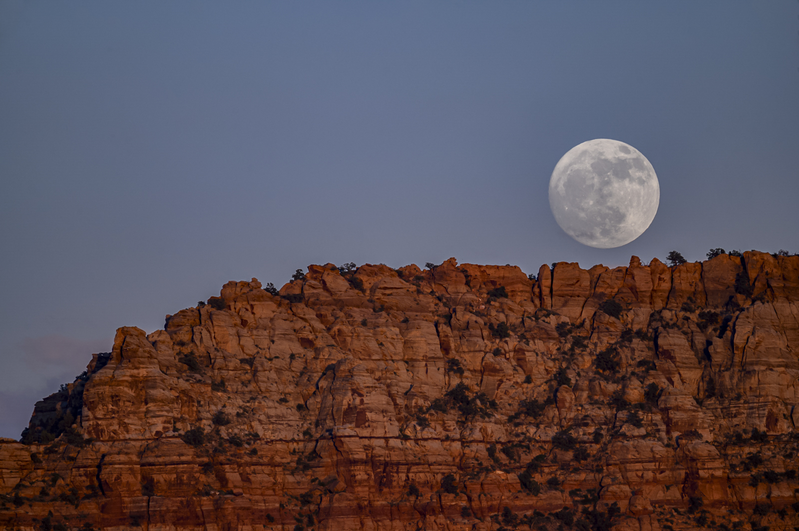 A nearly full moon rises behind a butte in Cane Beds, AZ, on the Summer Solstice in 2024.
