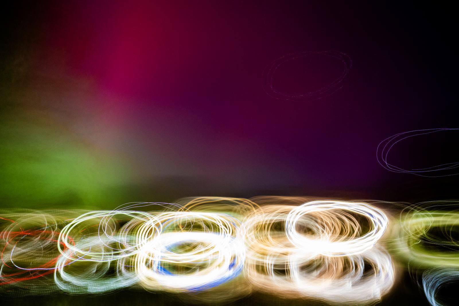 At 10 p.m., I stopped by Lake Andrews and the Bates Museum of Art in search of the Northern Lights. After making a couple of predictable frames (along with everyone else on campus) that featured water in the foreground, and the vivid sky lighting up the museum in the background, I decided to let my freak flag fly. Removing the camera from its tripod, I maintained a long exposure and swung it around my head.