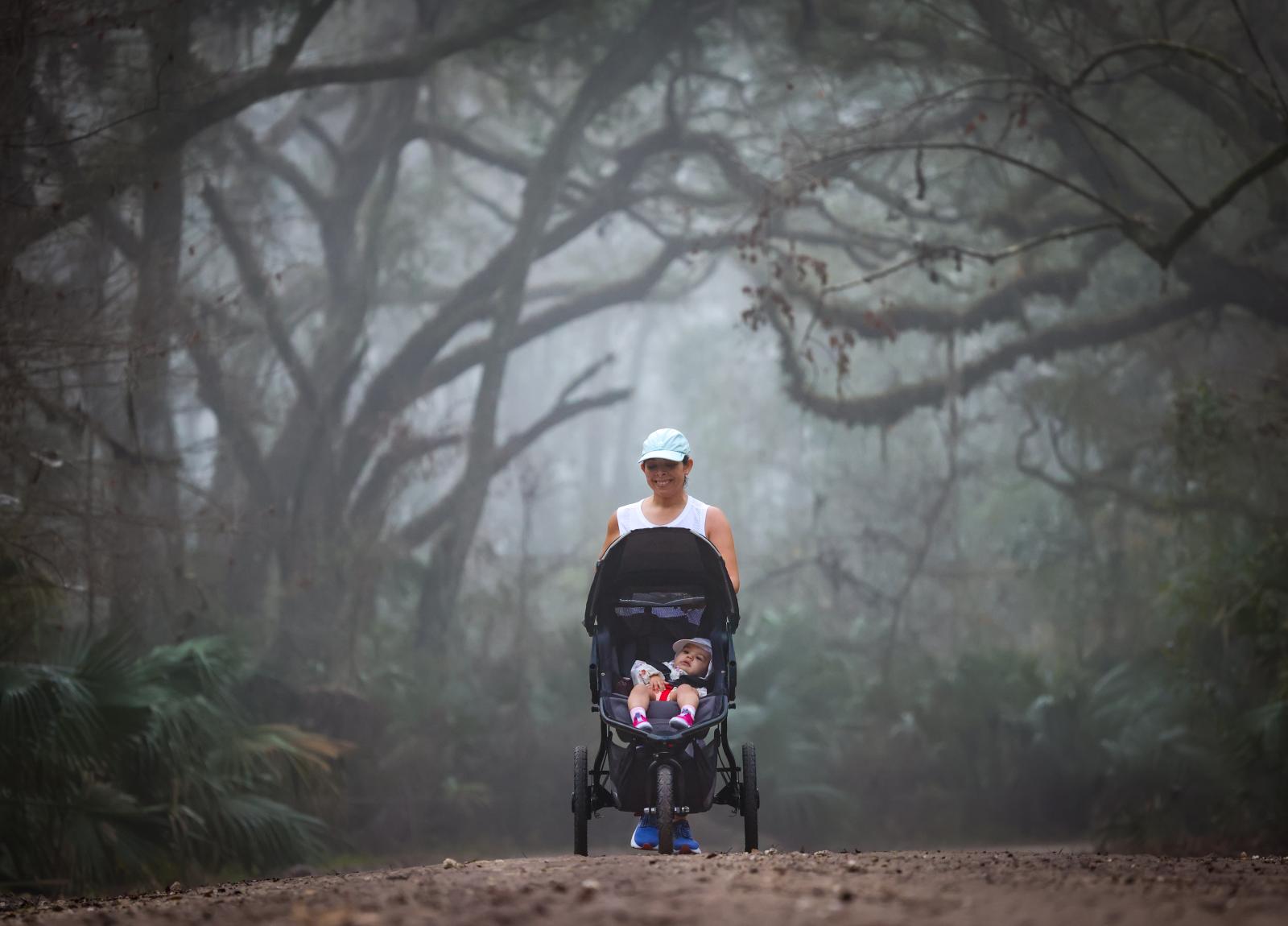 A runner and her baby make their way along the five-mile course during the Florida Track Club's Micanopy race on Feb. 8, 2025.